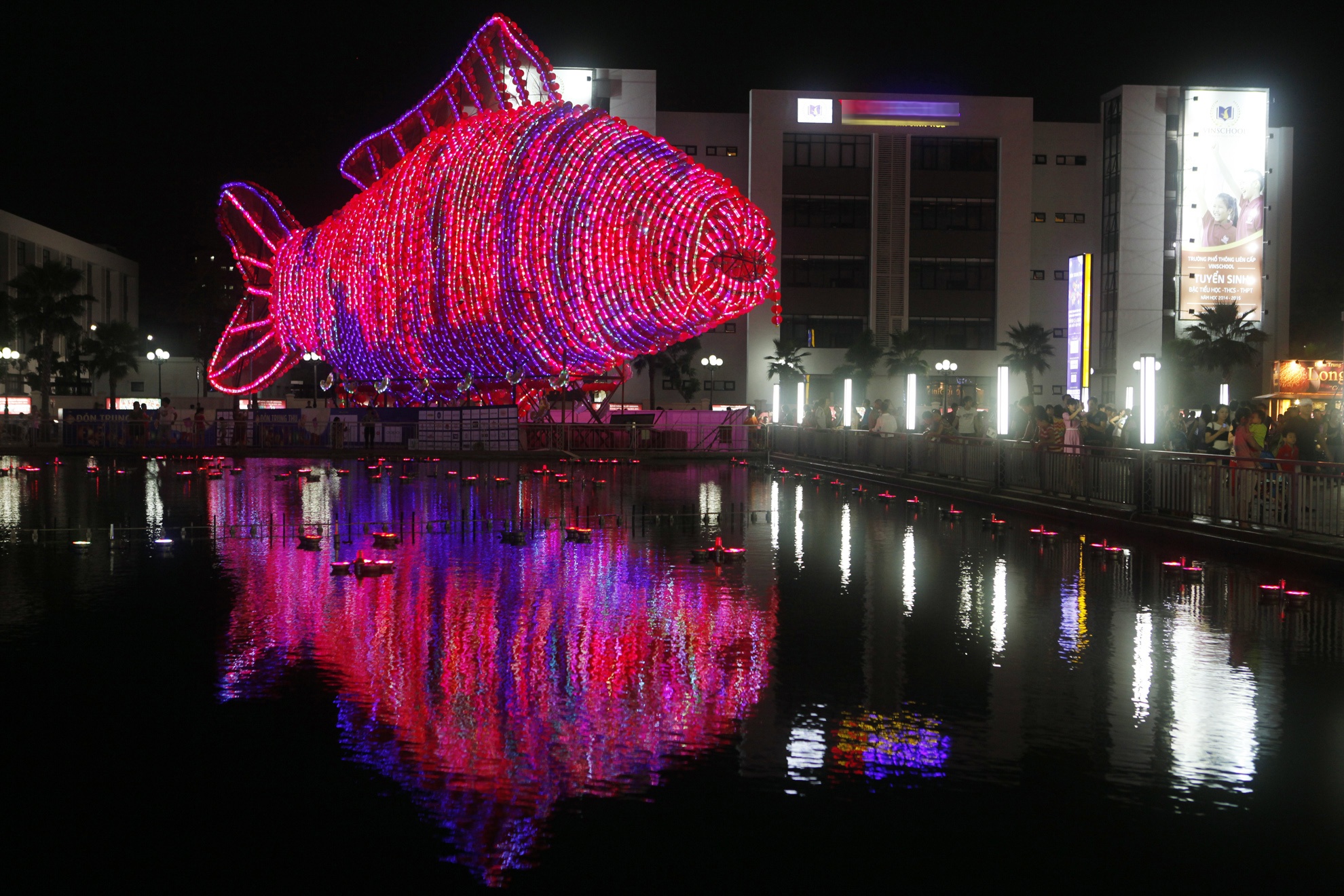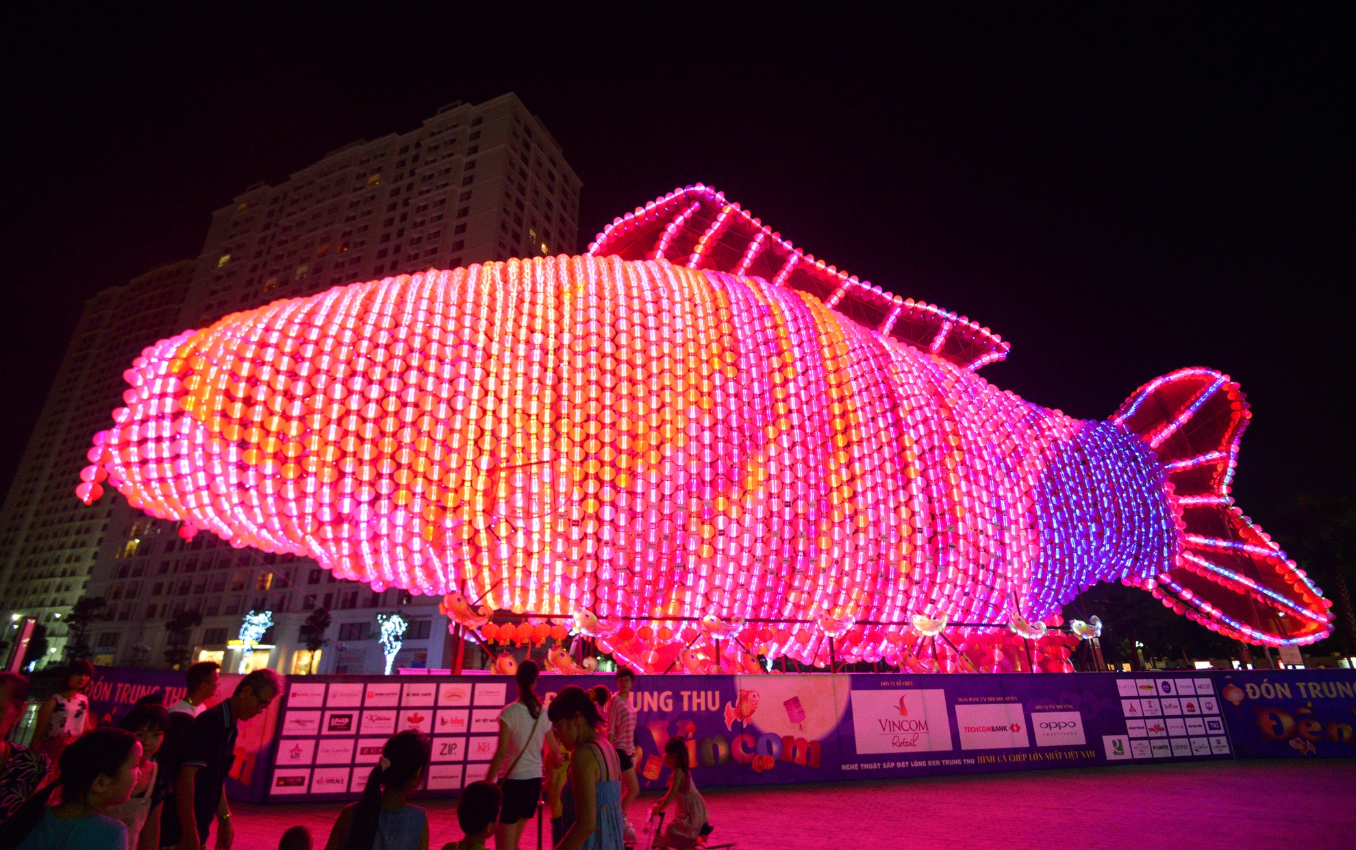Đèn lồng cá chép khổng lồ tại quảng trường Trung tâm thương mại Vincom Mega Mall - Times City (Hà Nội) rực rỡ trong đêm khai mạc. Đèn cao 15m, dài 32 m, kết từ hơn 5.000 đèn lồng nhỏ (bên trong là 5.000 bóng đèn led) được coi là một “tuyệt phẩm ánh sáng”. |