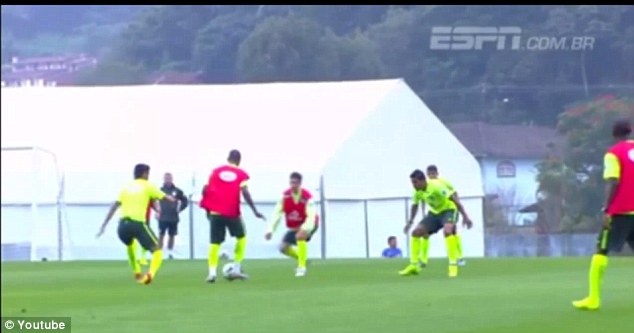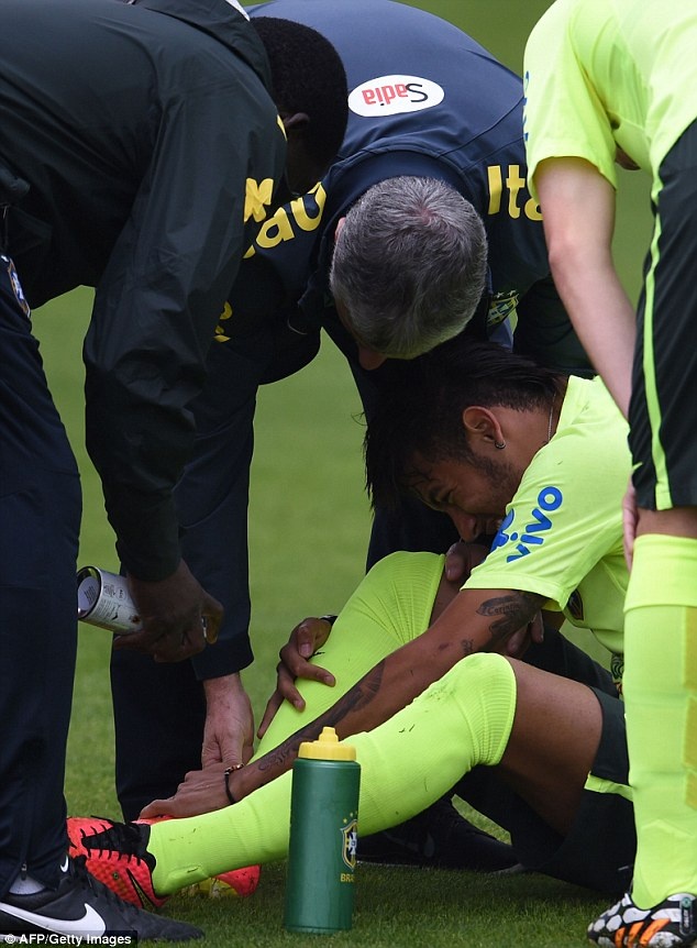 | Tuy nhiên, đội chủ nhà World Cup 2014 đón tin không vui khi Neymar dính chấn thương mắt cá chân và cần tới sự chăm sóc của các nhân viên y tế ngay trên sân tập. |
