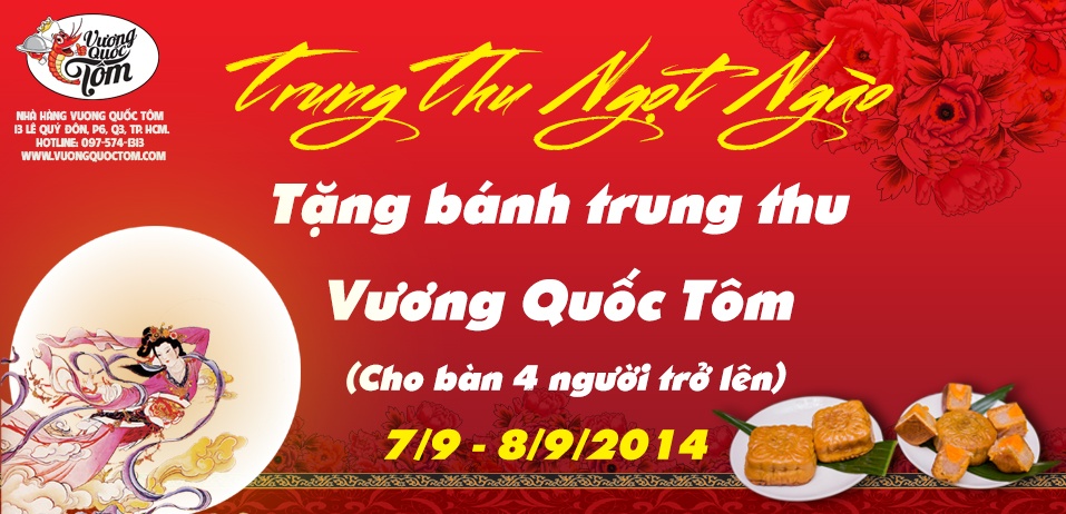 Nhân dịp Trung thu năm nay, nhà hàng Vương Quốc Tôm thực hiện chương trình khuyến mãi đặc biệt mang tên Trung thu ngọt ngào. Theo đó, với mỗi bàn tiệc dành cho 4 người, thực khách sẽ được tặng kèm một chiếc bánh trung thu Vương Quốc Tôm thơm ngon, để cuộc vui bên gia đình hoặc bạn bè được thêm phần ấm cúng.