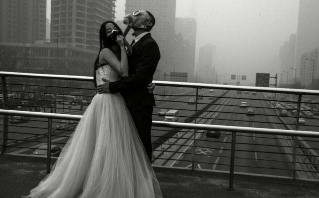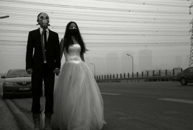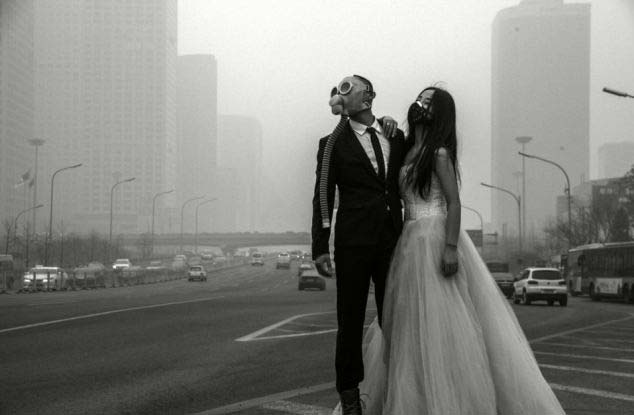 | Bức hình cưới lạ tại Trung Quốc. Tình trạng ô nhiễm không khí tại thủ đô Bắc Kinh, Trung Quốc, được xếp vào nhóm báo động vàng, mức độ cao thứ 2 trong hệ thống cảnh báo ô nhiễm 4 bậc ngày 21/2. Ở mức độ này, trường học phải hủy các lớp học ngoài trời hoặc đóng cửa. Các phương tiện sẽ phải hạn chế đi lại. |