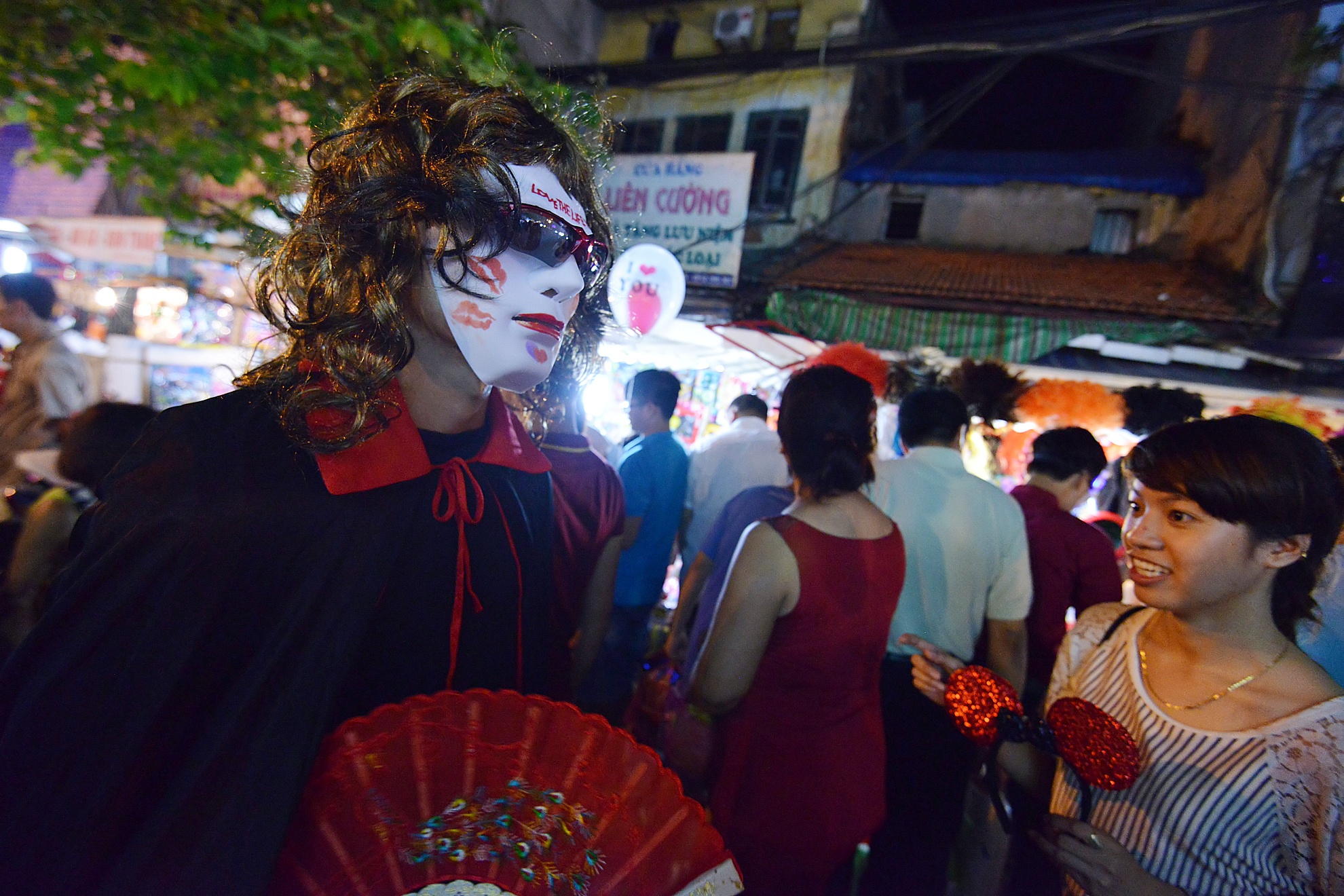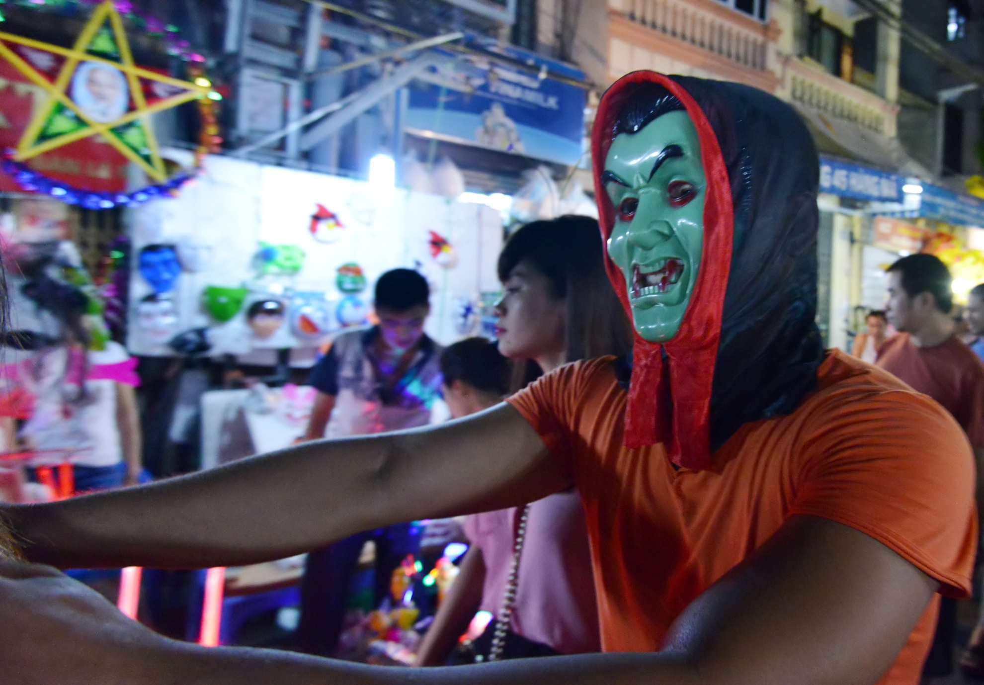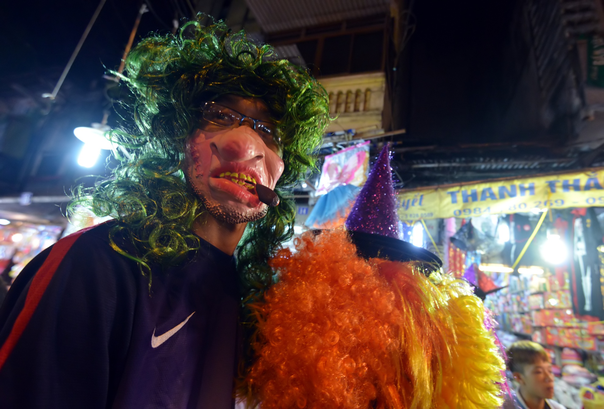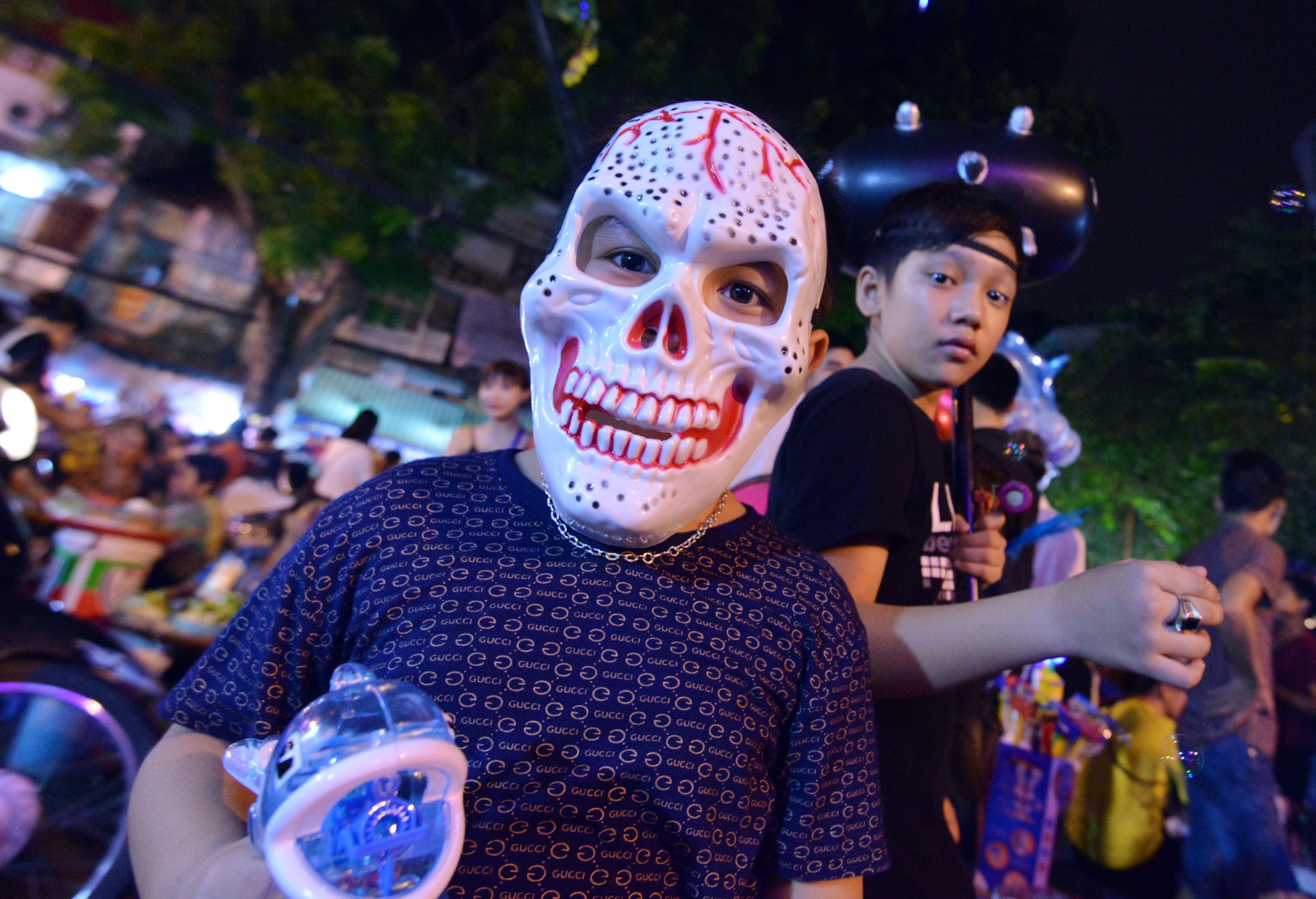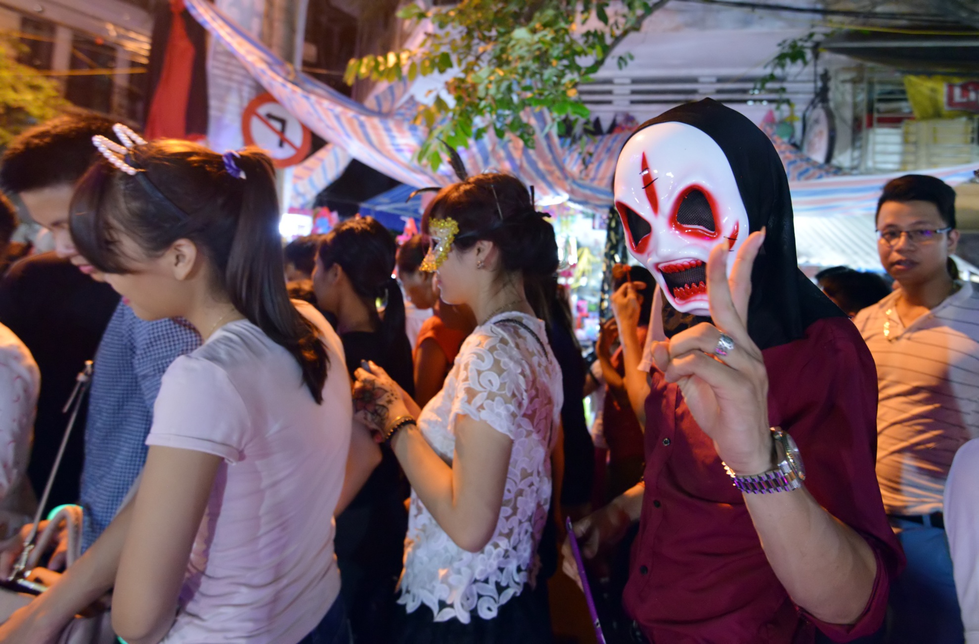 Mặc dù bị cấm nhưng nhiều gian hàng vẫn bày bán những chiếc mặt nạ kinh dị có xuất xứ từ Trung Quốc, thu hút nhiều người mua hơn so với loại truyền thống. Mỗi chiếc giá từ 100.000 - 150.000 đồng.