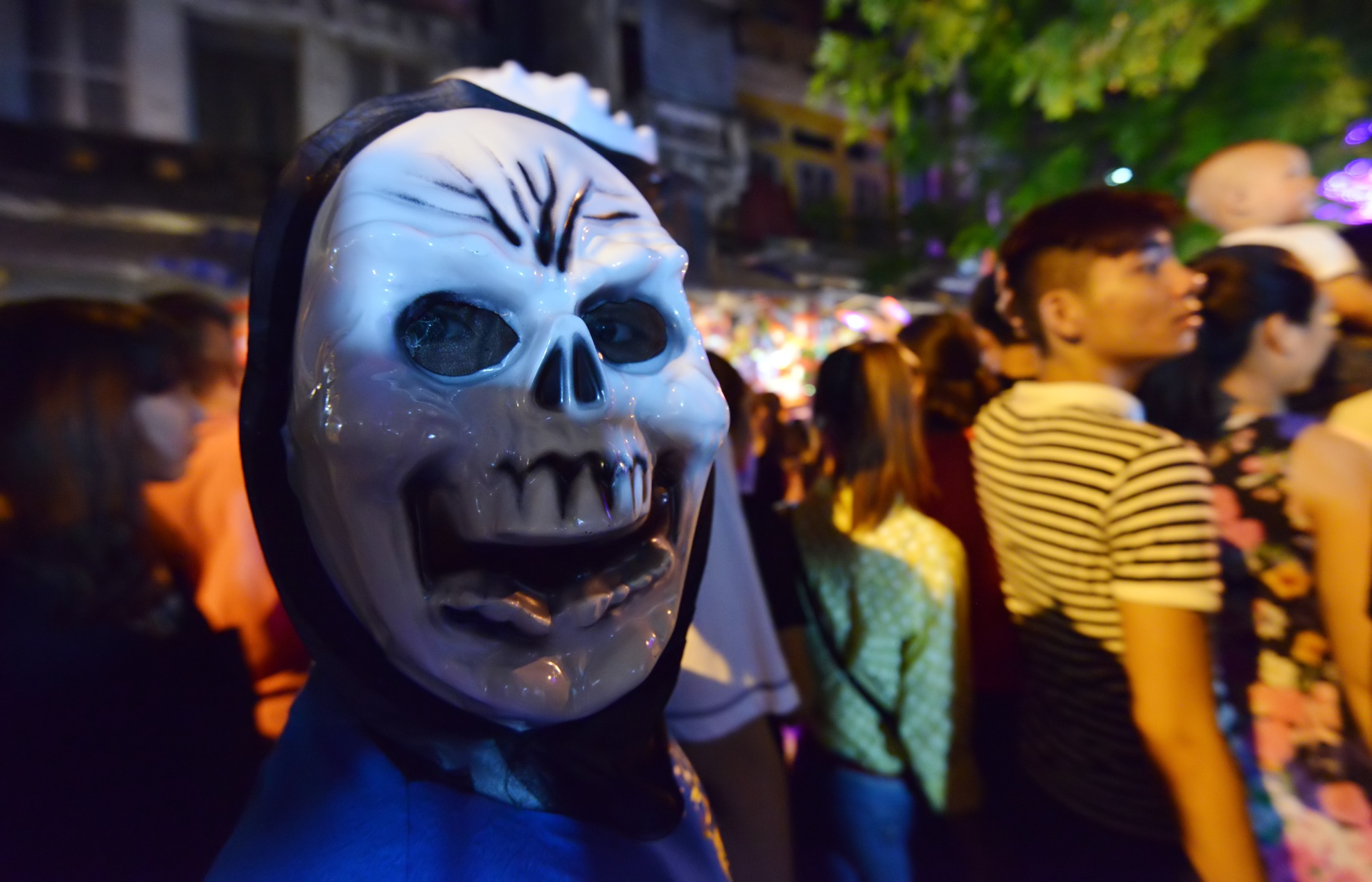 Một số thanh niên dạo chơi phố trung thu Hà Nội đeo mặt nạ kinh dị đi lại giữa dòng người khiến nhiều phụ nữ khiếp sợ.