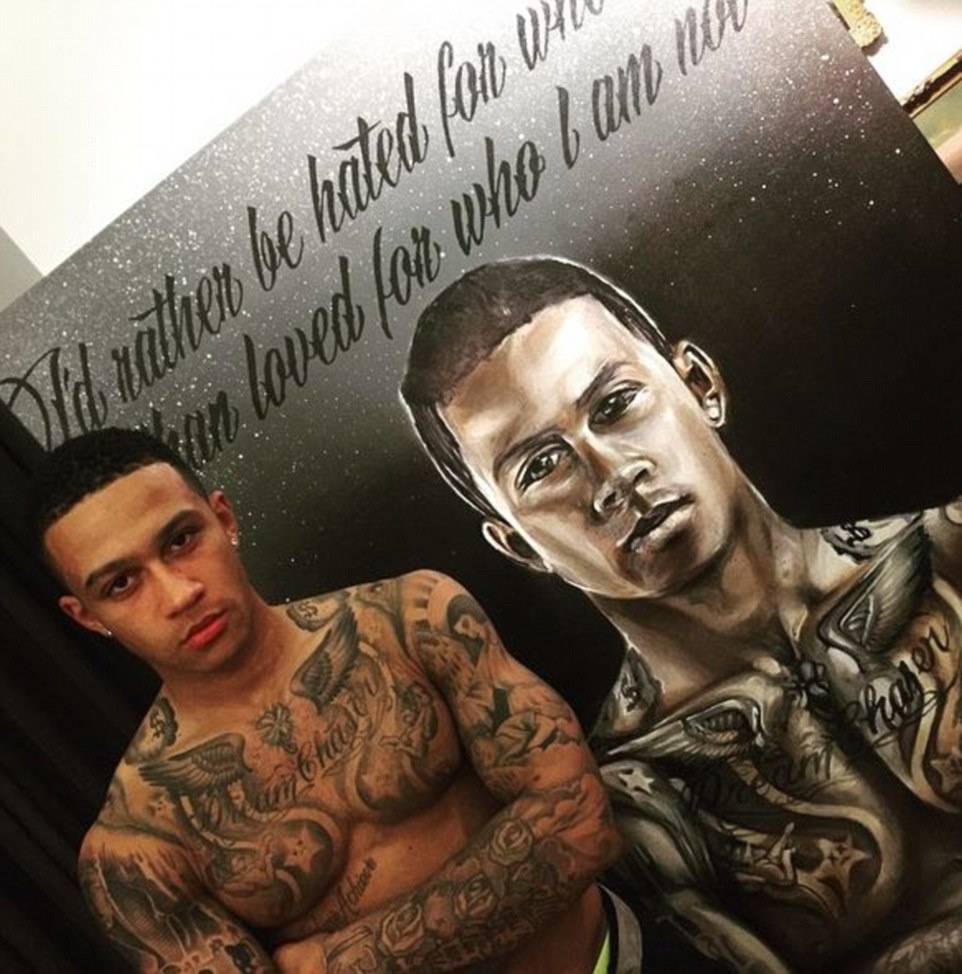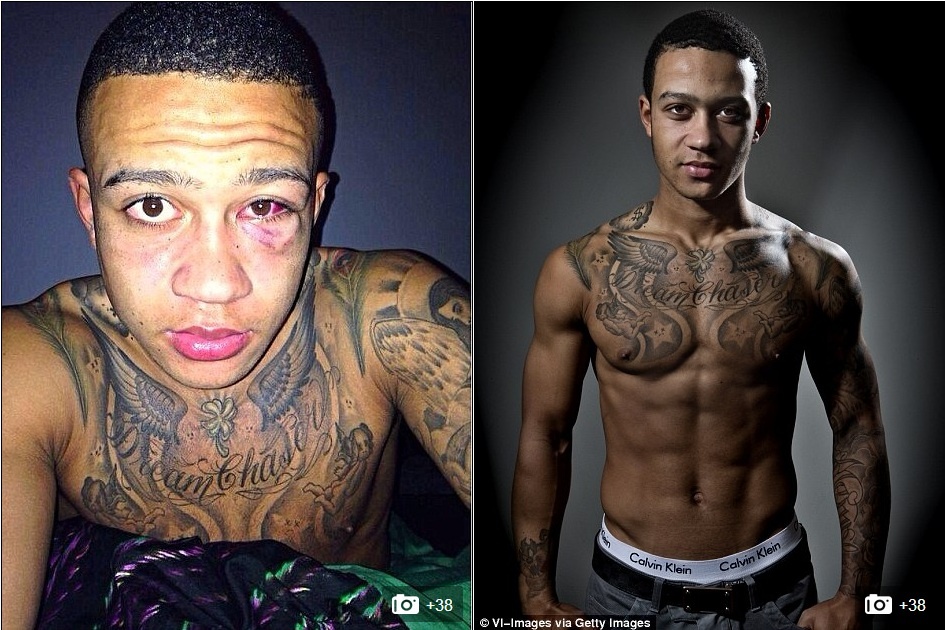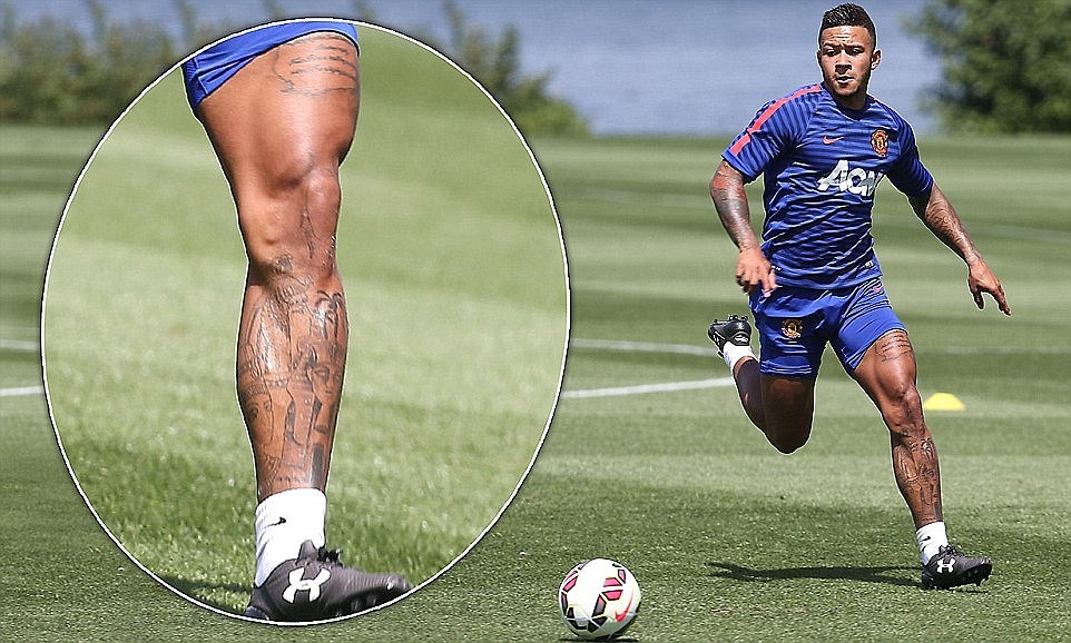 | Những hình xăm trên bắp chân săn chắc của Depay luôn gây tò mò cho người hâm mộ. |