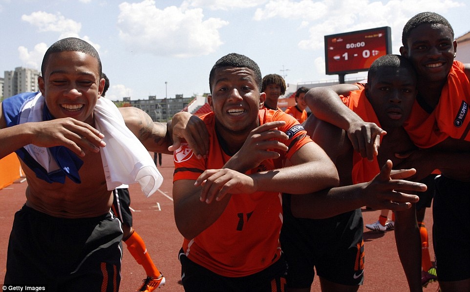 | Depay (trái) ăn mừng khi giúp đội trẻ Hà Lan đánh bại tuyển trẻ Anh tại bán kết giải U17 châu Âu diễn ra tại Novi Sad, Serbia tháng 5/2011. |