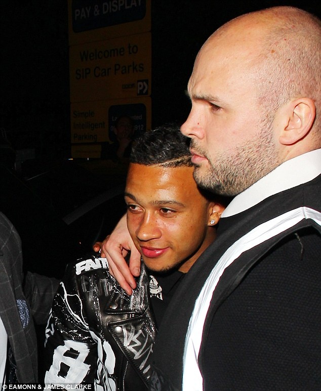 | Ngôi sao chạy cánh Memphis Depay xuất hiện tại hộp đêm với thời trang lạ mắt. Anh khoác áo da bên ngoài chiếc áo sơ mi sẫm in hình đầu lâu. Ngoài ra, tân binh của Manchester United còn gây chú ý khi đeo những chiếc răng vàng giả. |