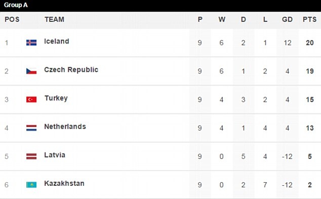 | Vị trí của các đội ở bảng A trước lượt trận cuối. ĐT Iceland và ĐT Séc đã giành vé trực tiếp dự vòng chung kết EURO 2016. |