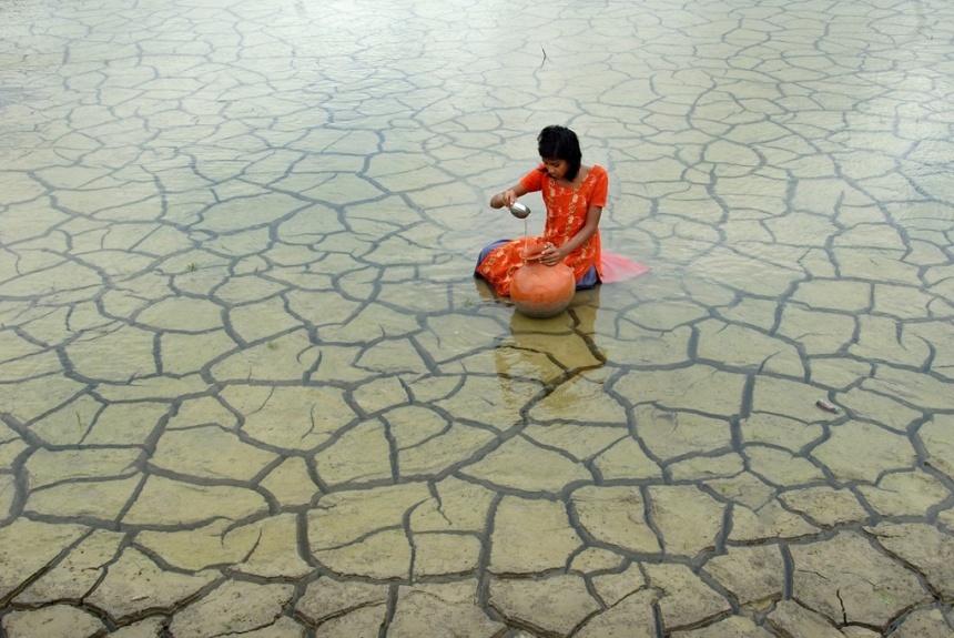 Bức ảnh “Thiếu nữ gom nước mưa” của nhiếp ảnh gia Prasanta Biswas người Ấn Độ. Tác giả ghi lại khoảnh khắc người dân sống ở Sundarban, bang West Bengal phải lọc nước mưa trên nền đất để sử dụng vì hạn hán. Biến đổi khí hậu khiến thời tiết trở nên cực đoan, kéo theo nhiều hậu quả nghiêm trọng. |