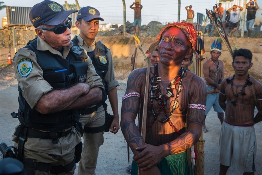 Nhiếp ảnh gia Taylor Weidman người Thái Lan ghi lại khoảnh khắc những người thổ dân Munduruku đối diện với cảnh sát liên bang ở đập Belo Monte, gần Altamira, Brazil. Thổ dân phản đối sự hiện hữu của con đập vì nó làm giảm sản lượng cá trên dòng sông Xingu, khiến cuộc sống của họ gặp muôn vàn khó khăn. |