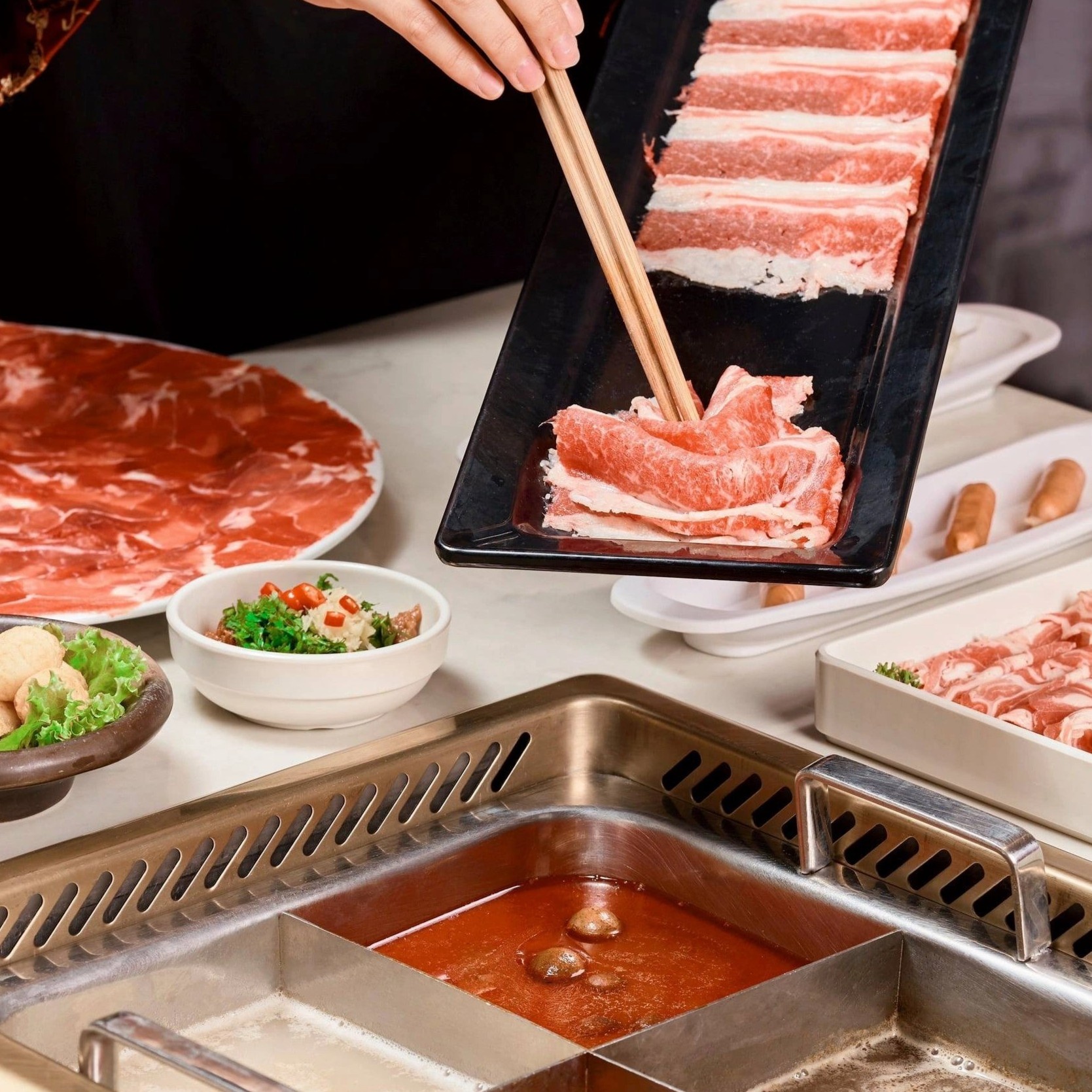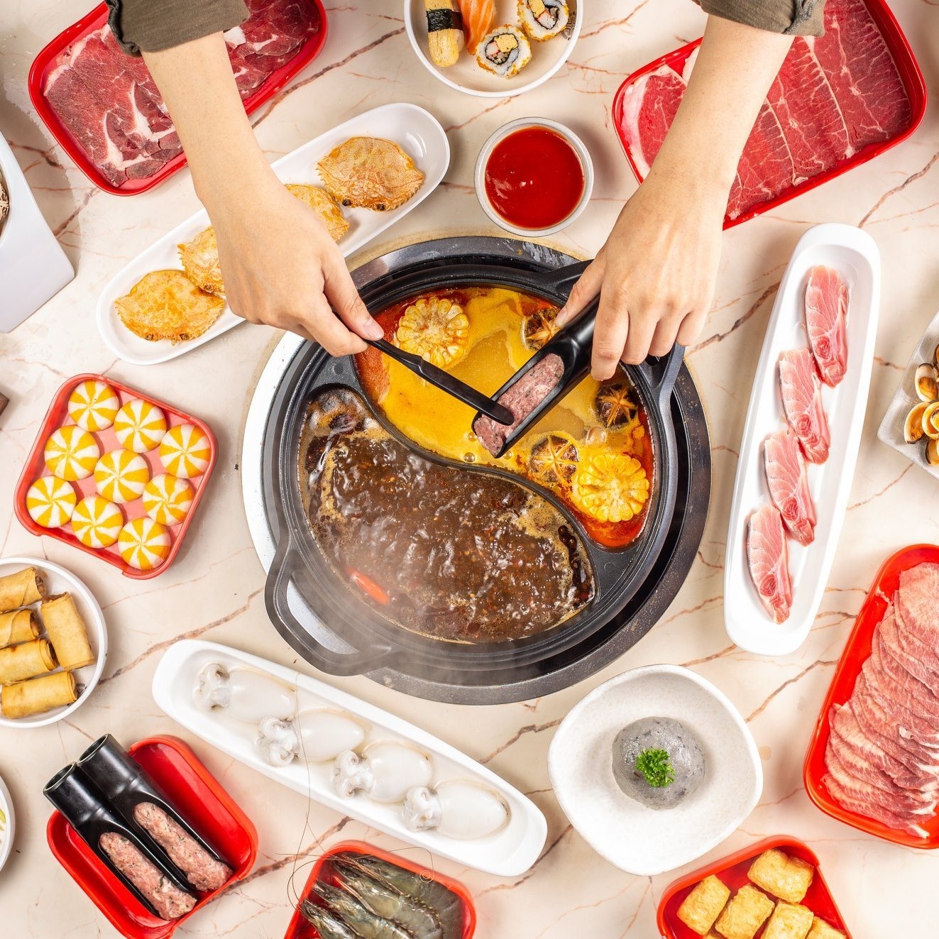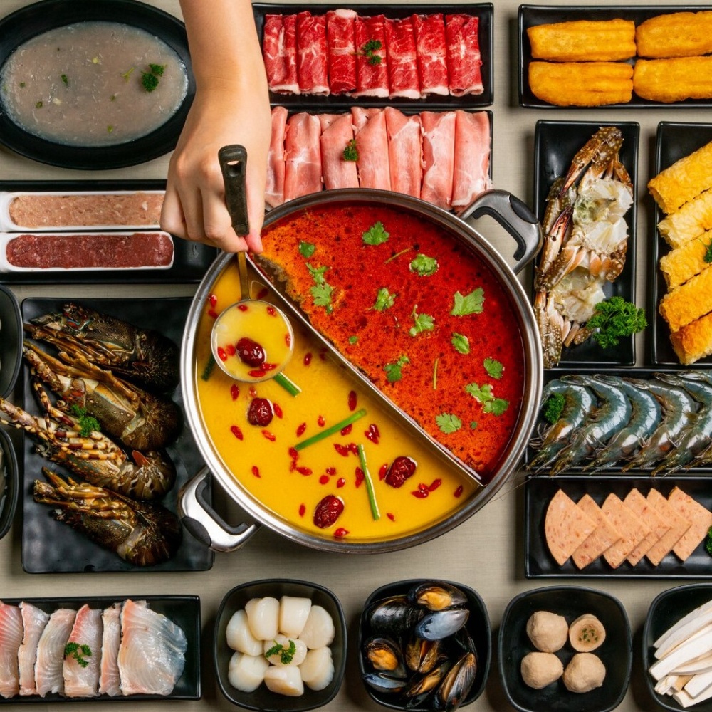 Thực đơn ở đây đa dạng với thịt bò, heo, tôm, mực, cá... tươi ngon. Đi đông người, bạn có thể chọn nồi 4 ngăn để nếm hết vị cay cay, chua chua của lẩu Malay, Thái hay độ ngọt tự nhiên trong lẩu nấm, lẩu Đài Bắc...