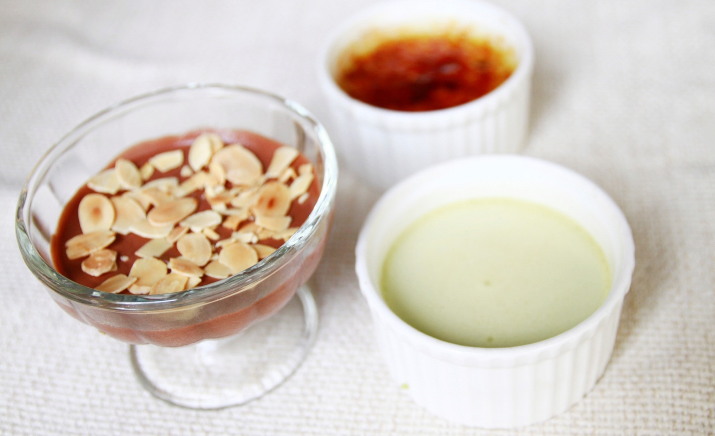 | Bánh mousse socola hạnh nhân và bánh flan nóng caramel/ trà xanh. |