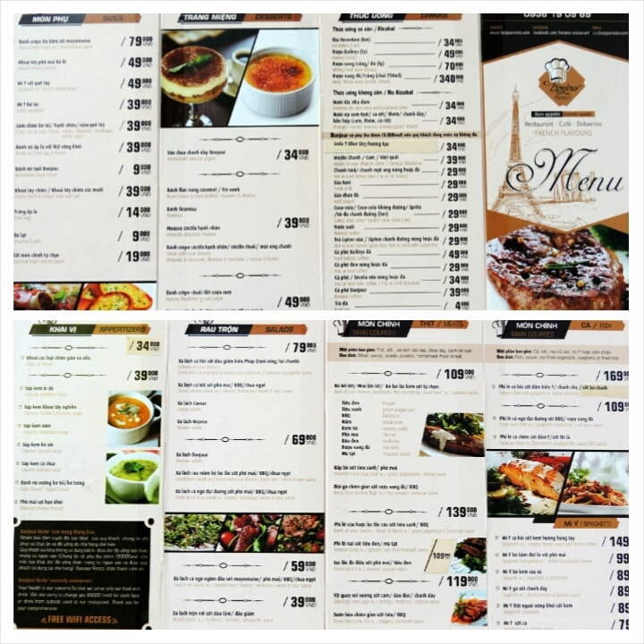 Bonjour Resto’ là nhà hàng Pháp trên đường Nguyễn Trãi (Q.1, TP.HCM), nơi mà khi nghiền ngẫm thực đơn, chúng tôi hoàn toàn bất ngờ với giá các món ăn chỉ từ 39.000 đồng; các món nước và bánh ngọt là 34.000 đồng.