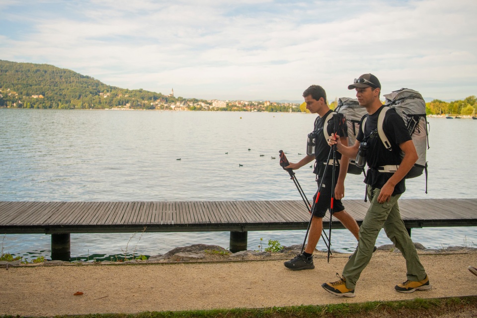 Loïc Voisot và Benjamin Humblot khởi hành từ cảng Petit Port d'Annecy-le-Vieux (Pháp), bắt đầu chuyến đi bộ đến Trung Quốc, ngày 7/9/2024. Ảnh: Annecy. |