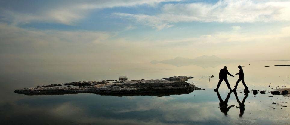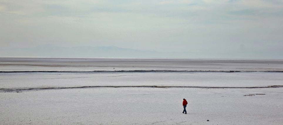 | Một người dân đi bộ ở đáy hồ nước mặn lớn nhất thế giới. Oroumieh đã thu hẹp diện tích vì biến đổi khí hậu và các hoạt động phục vụ thủy lợi. |
