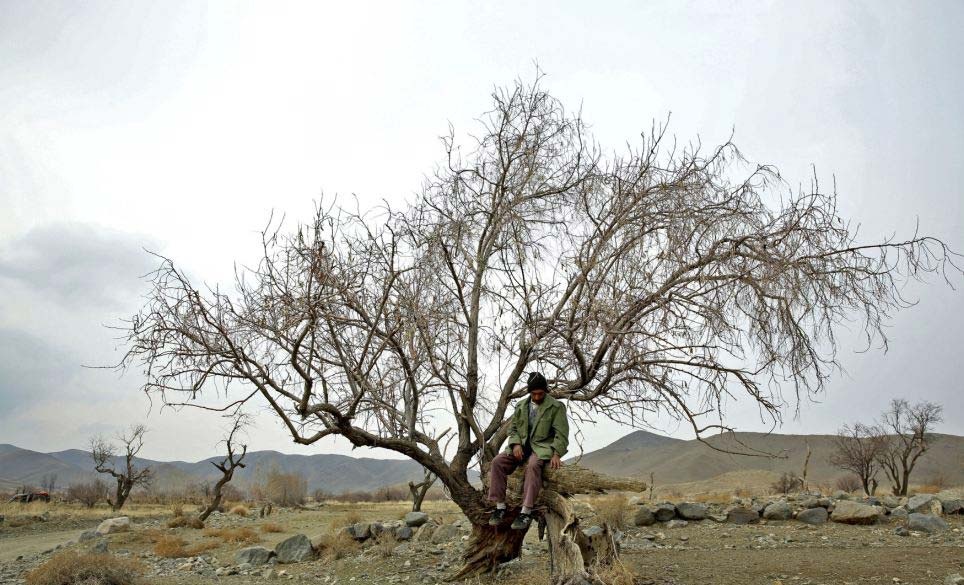 | Reza, một người dân Iran, ngồi trên cây khô gần hồ Oroumieh. Diện tích Oroumieh giảm xuống còn 1.000 km, thu hẹp 80% so với diện tích ban đầu. |