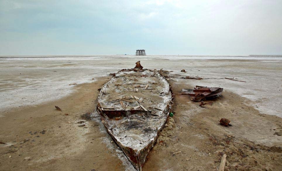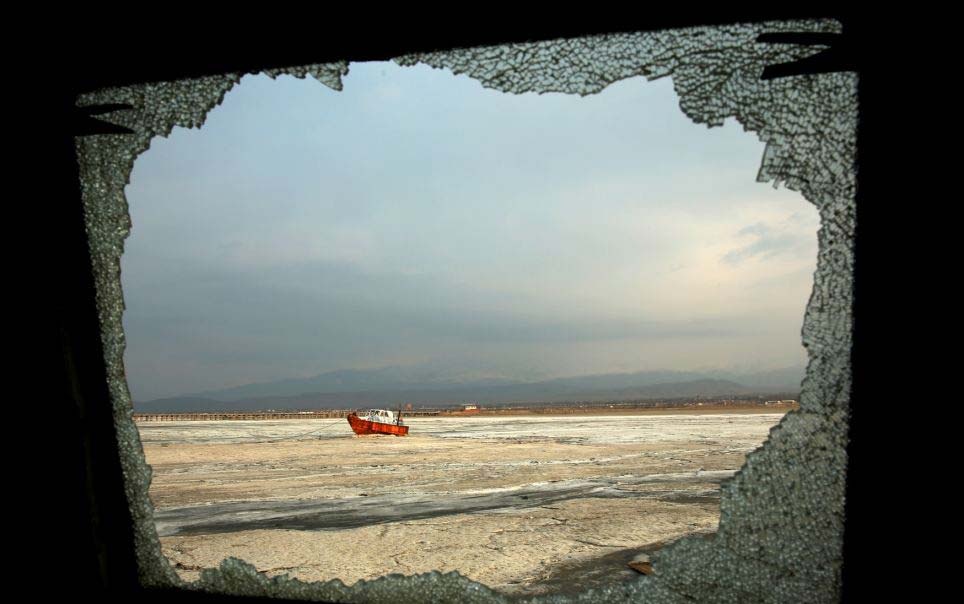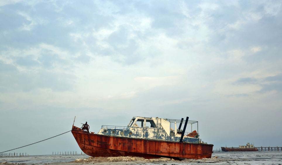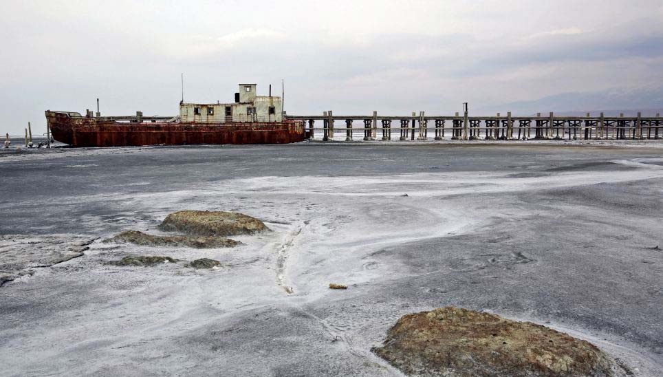 | Tàu mắc cạn trên hồ Oroumieh. Nơi đây từng nổi tiếng là điểm du lịch và là điểm dừng chân của hồng hạc, bồ nông và mòng biển. Nếu nhà chức trách không đưa ra biện pháp phù hợp, hồ có thể sẽ biến mất trong vòng 2 năm tới. |