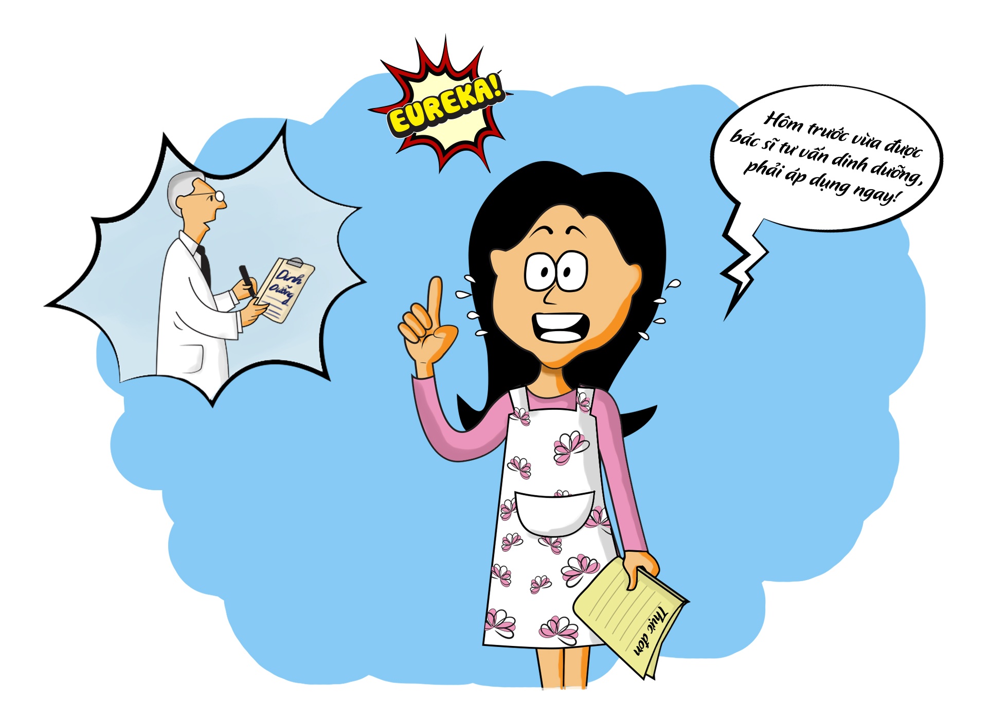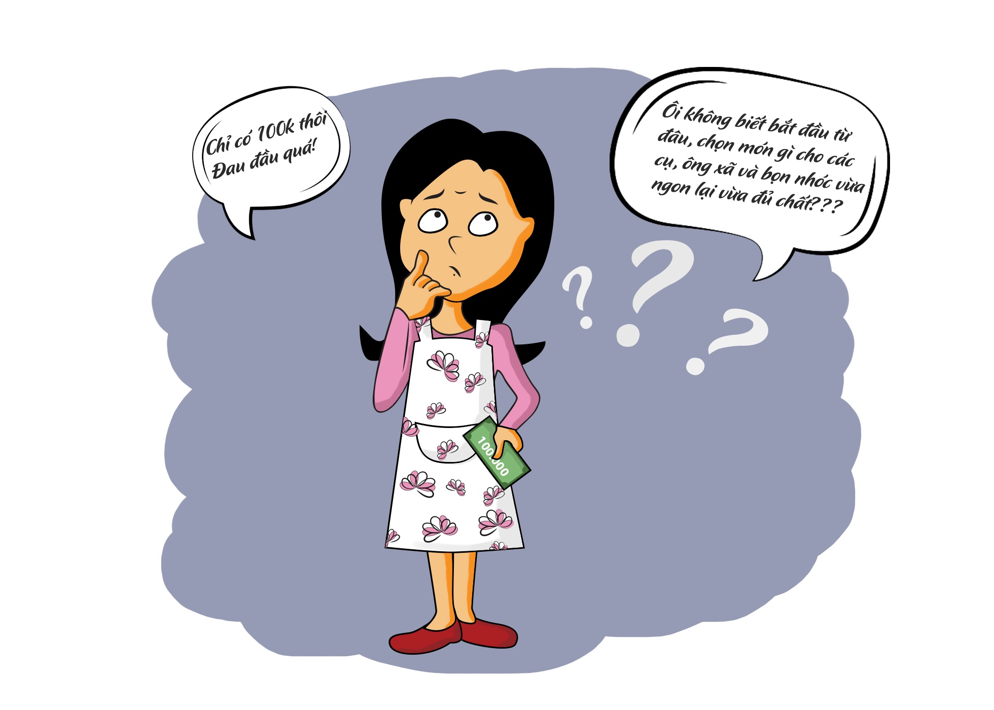 Bữa ăn dinh dưỡng giá rẻ dành cho các bà nội trợ do bác sĩ Dzoãn Thị Tường Vy, nguyên Trưởng khoa Nhi, Bệnh viện 198, tư vấn được thể hiện bằng tranh vẽ.