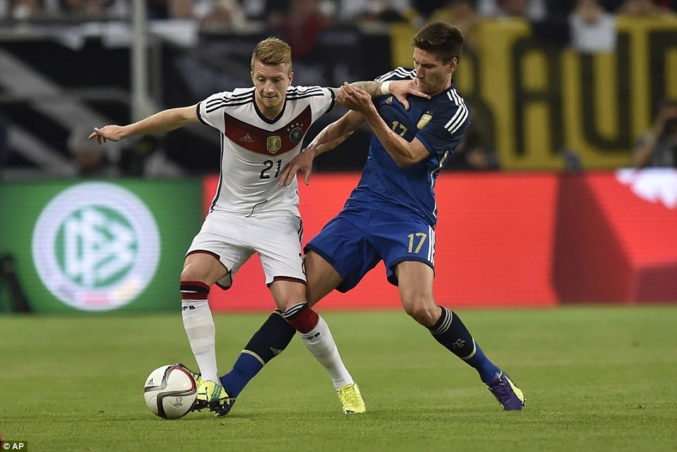 | Marco Reus, cầu thủ không được dự World Cup vì chấn thương, cũng bất lực trước sự kèm sát của đối thủ. |