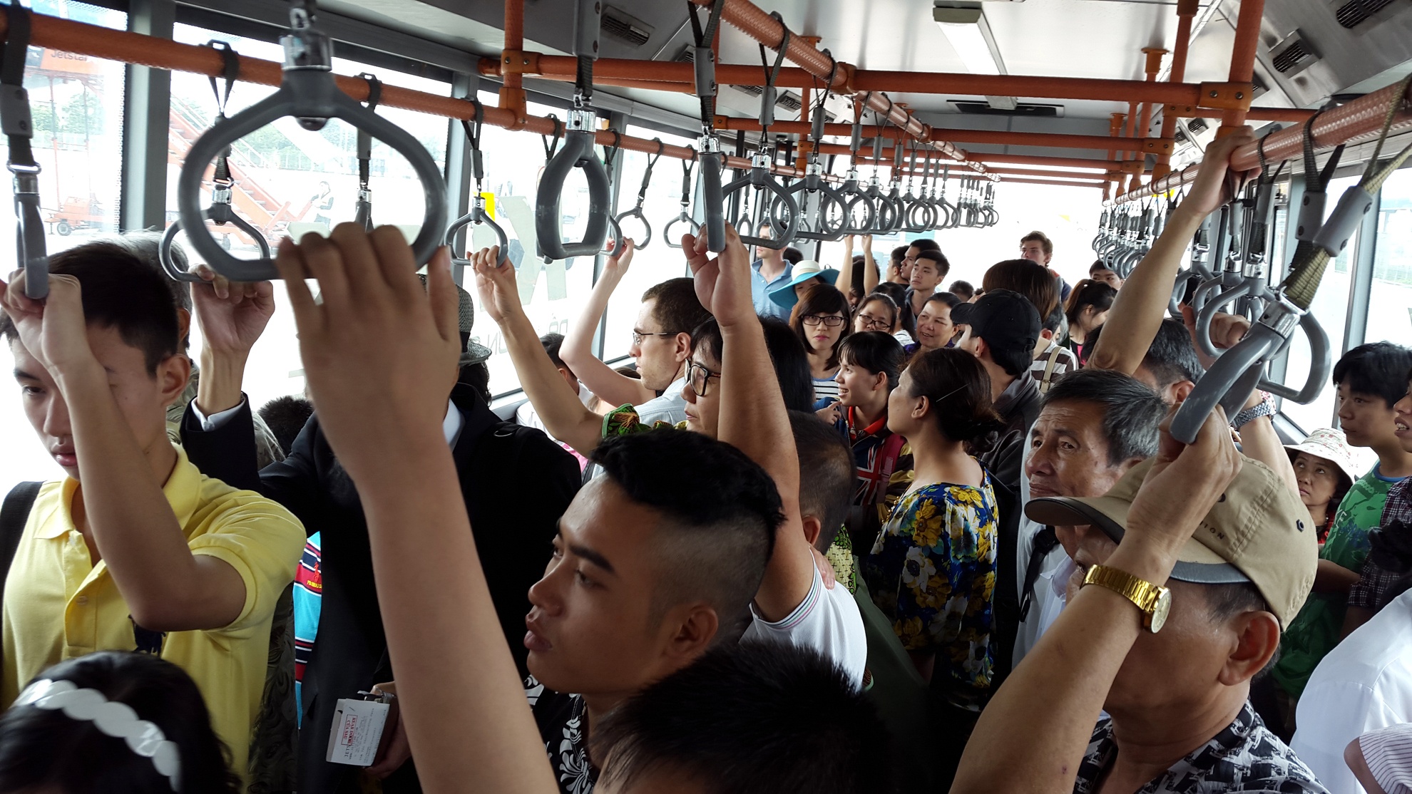 Trên xe chuyên chở từ cửa kiểm soát ra máy bay, rất đông trẻ em phải đứng hoặc chen chúc khổ sở, còn các hàng ghế thì người lớn được ngồi.