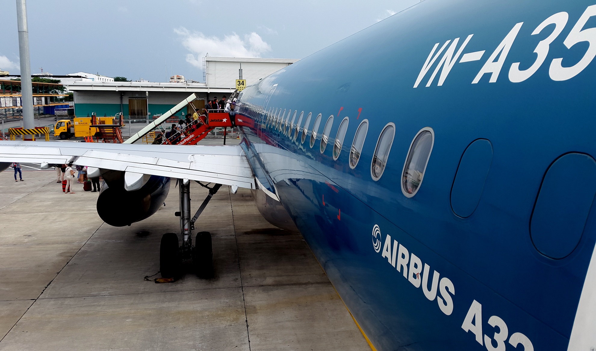 Nhiều hành khách trên chuyến bay Jetstar từ TP.HCM tới Hà Nội giật mình vì tưởng ra nhầm cửa khi được chở tới chân cầu thang phi cơ Airbus A321 có logo Vietnam Airlines.