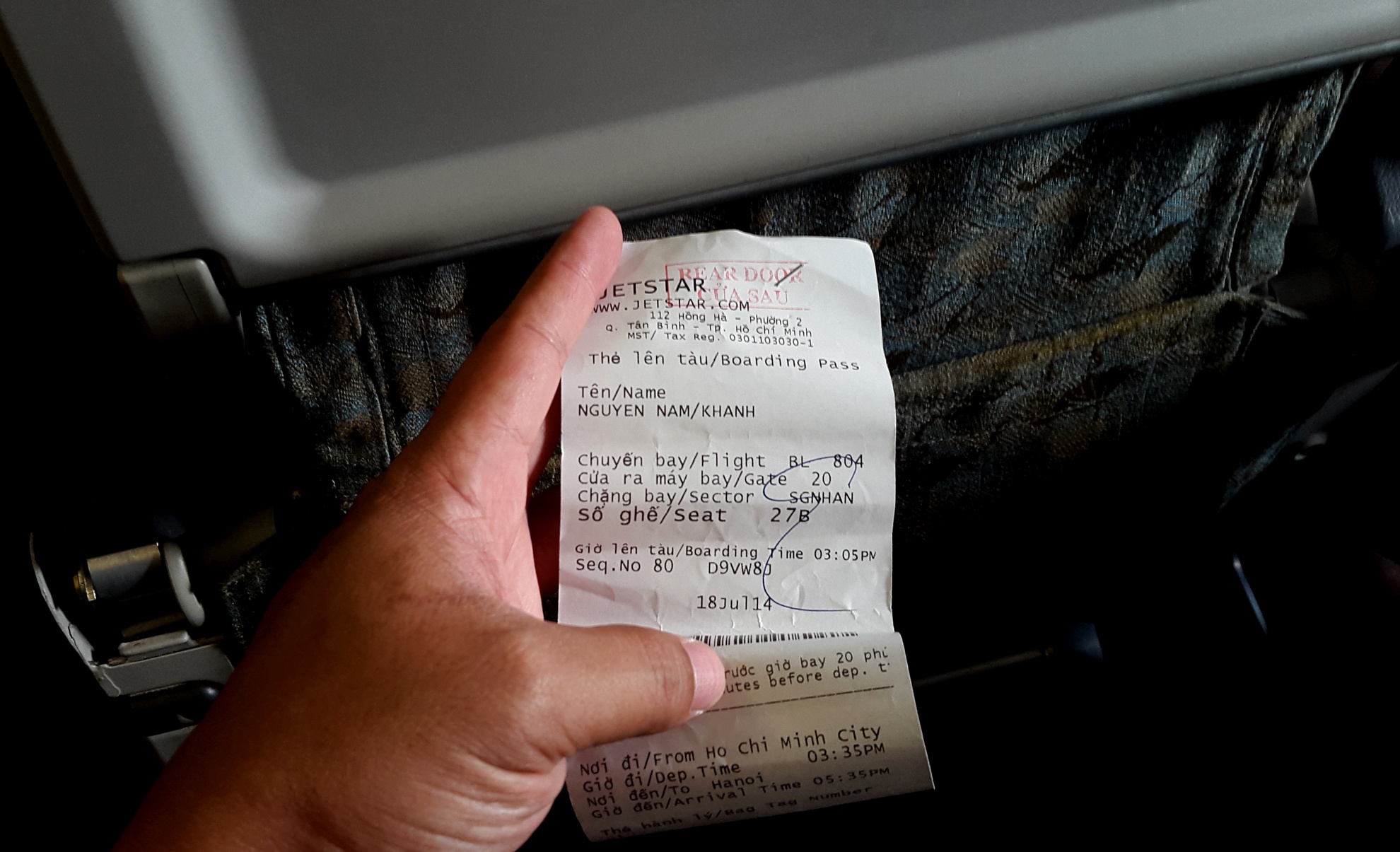 Khi làm thủ tục lấy Boarding Pass (thẻ lên tàu), dù phía trên vẫn còn chỗ và hành khách đề nghị gia đình có con nhỏ (8 tuổi), nhân viên quầy tại Tân Sơn Nhất vẫn xếp một gia đình đi chuyến bay này xuống hàng ghế gần cuối. Trong khi đó, nhân viên lại đề nghị nếu muốn ngồi ghế trên thì nên trả thêm phí (ngồi 6 hàng ghế đầu). Tuy nhiên, theo giải thích của một nhân viên Jetstar, việc sắp xếp chỗ ngồi dựa trên nguyên tắc cân tải để đảm bảo an toàn cho chuyến bay nên có thể dẫn tới sự việc nêu trên.