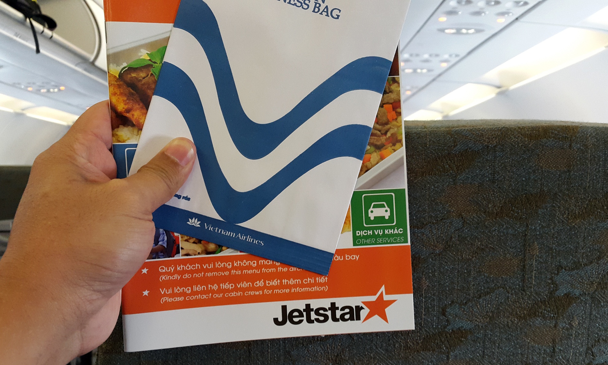 | Túi nôn Vietnam Airlines để lẫn với menu đồ ăn uống Jetstar sau lưng ghế. |