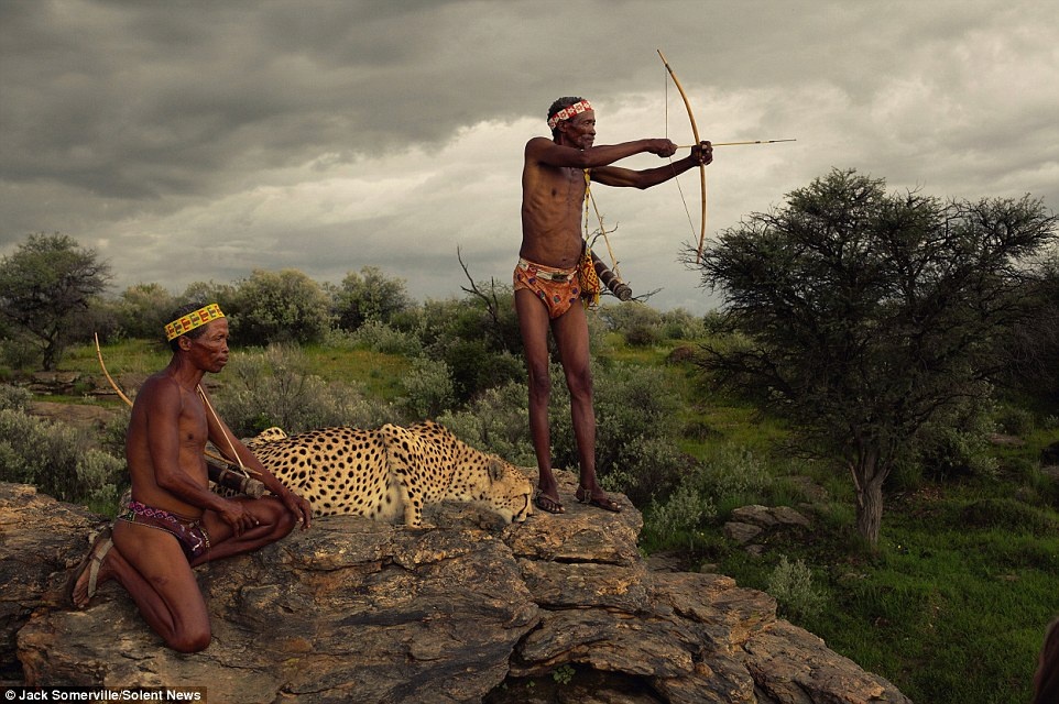 Hai thợ săn của bộ tộc San tỏ ra không sợ hãi khi sử dụng cung và mũi tên để săn bắt thú rừng cho bữa trưa của họ, ngay cạnh Aiko, một con báo cheetah trưởng thành. Báo cheetah hay còn gọi là báo săn, nổi tiếng là loài động vật ăn thịt nguy hiểm.