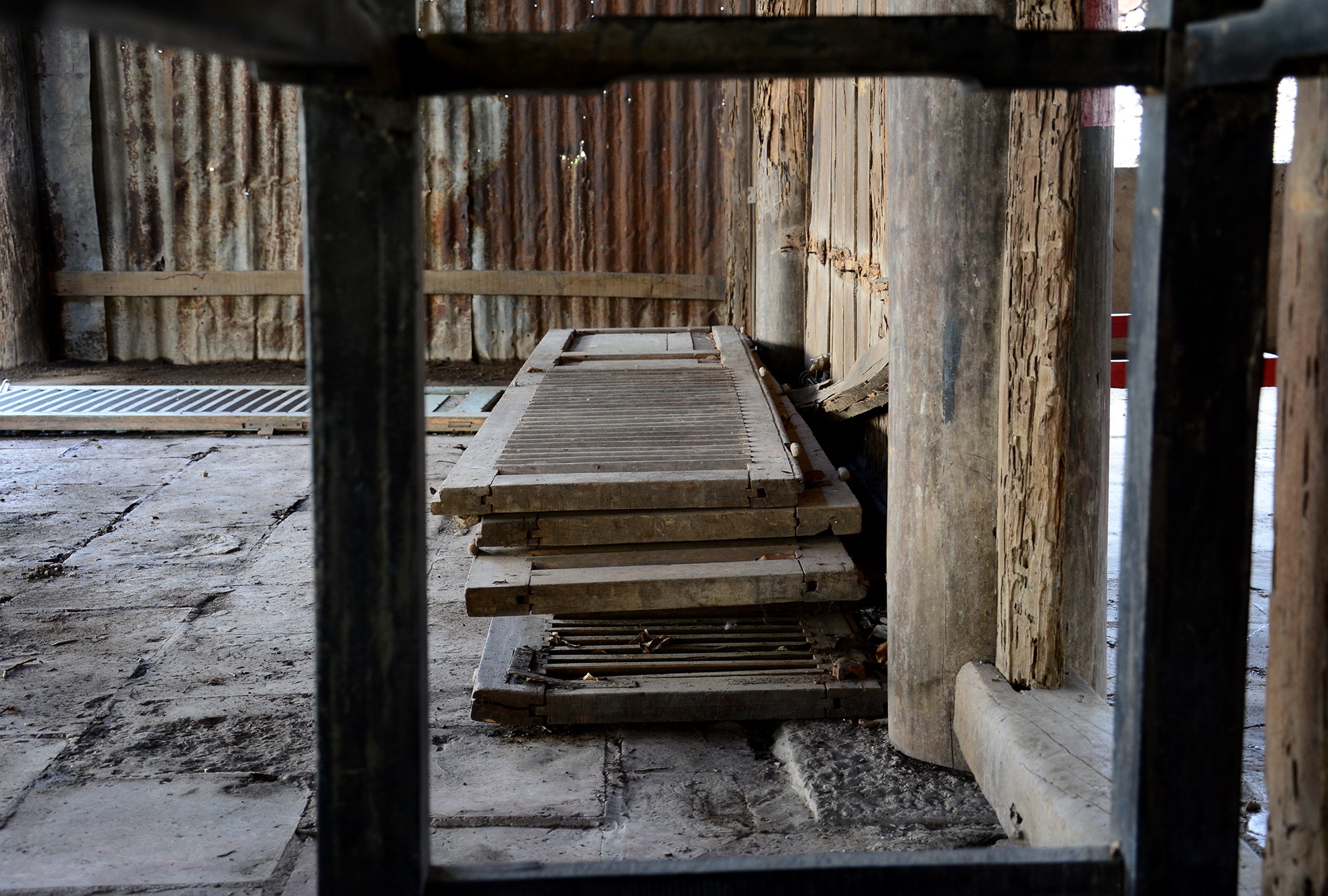 | Những tấm cửa bị hư hỏng sắp thành đống dưới nền phần sau nhà hội sở trông rất hoang tàn. |