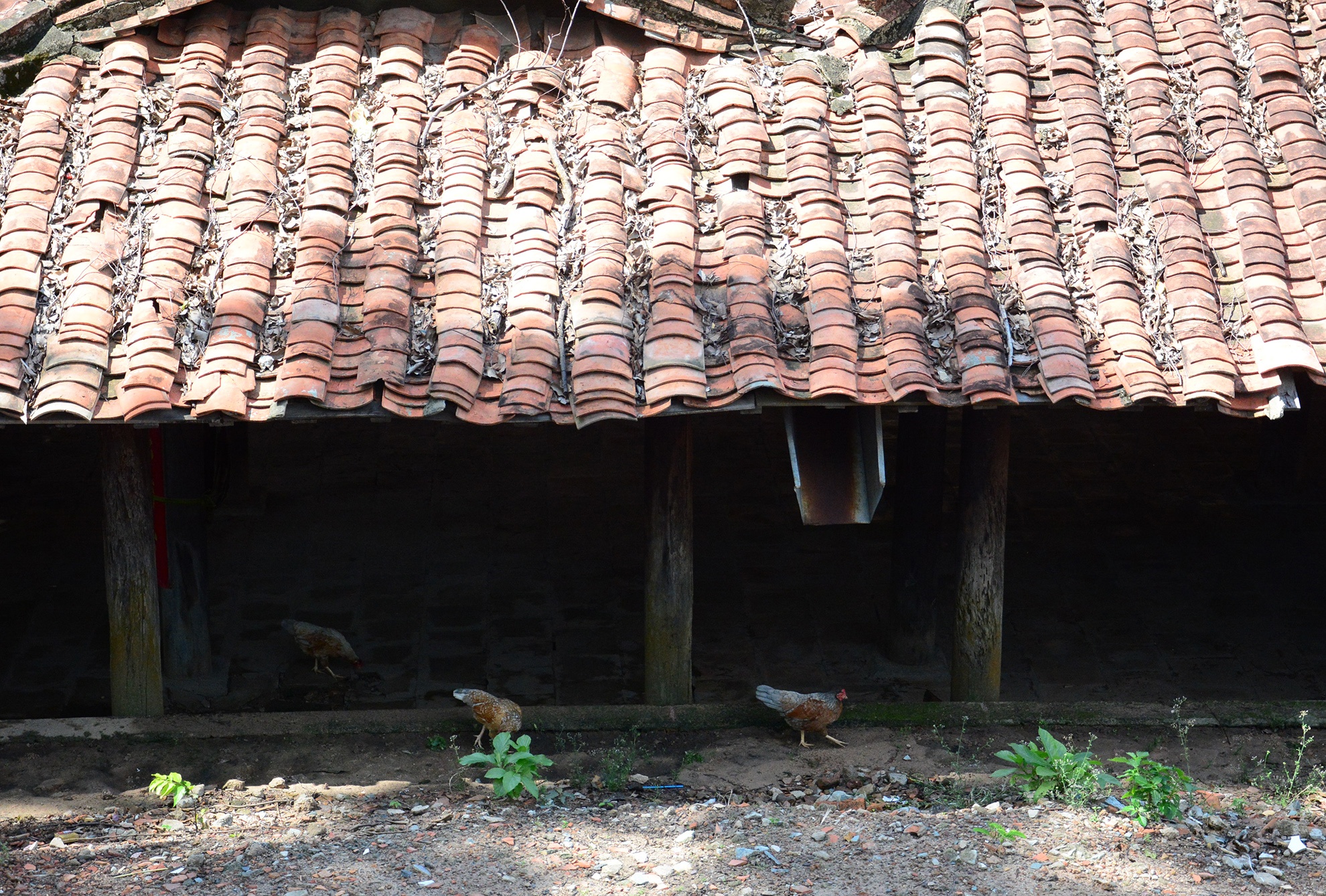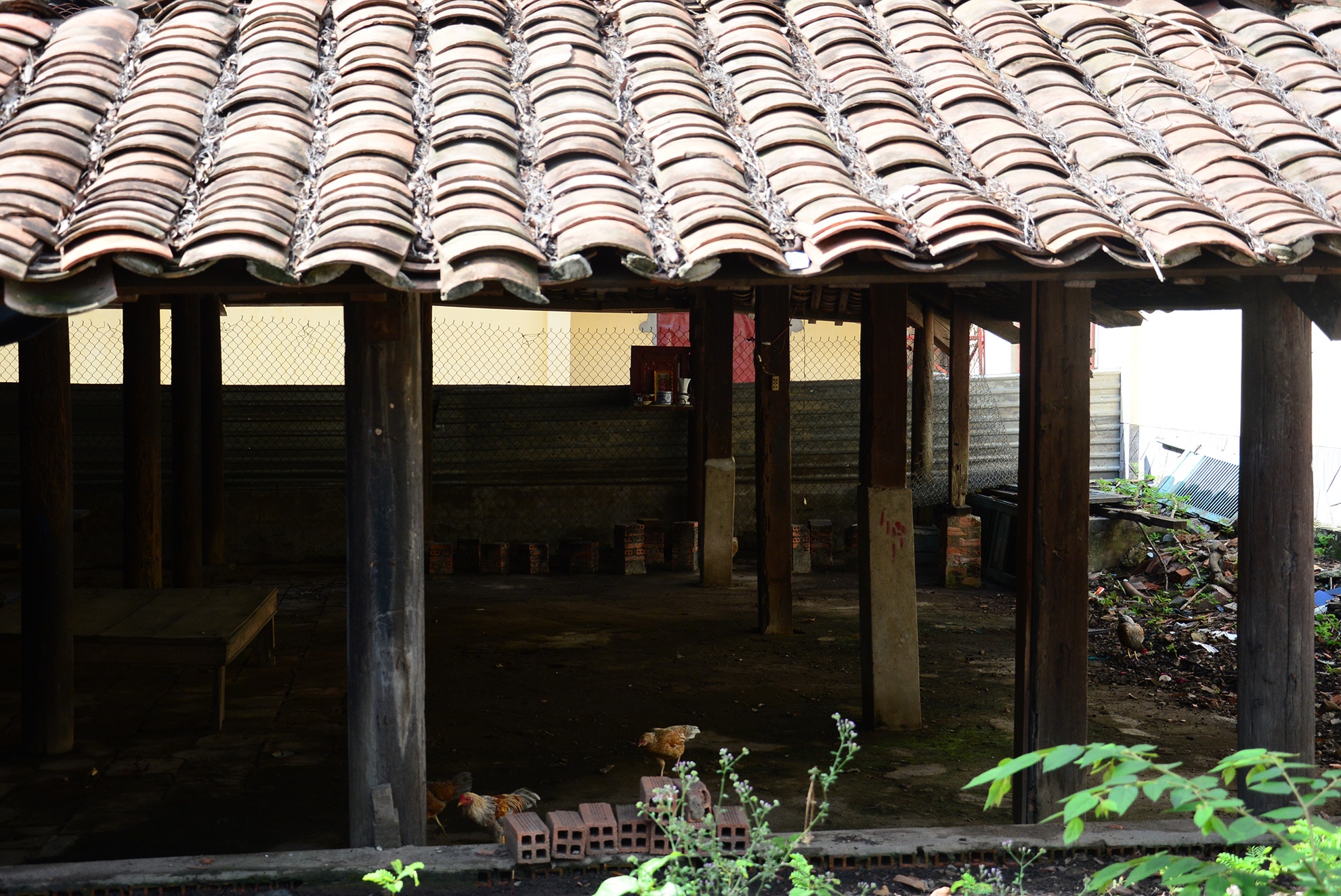 | Phần hậu nhà hội sở luôn trong tình trạng ẩm thấp, nhếch nhác, nhiều cột không còn khả năng chống đỡ phải kê bằng cột bê tông. Đây cũng là nơi gà kiếm ăn, trú ngụ hàng ngày. |