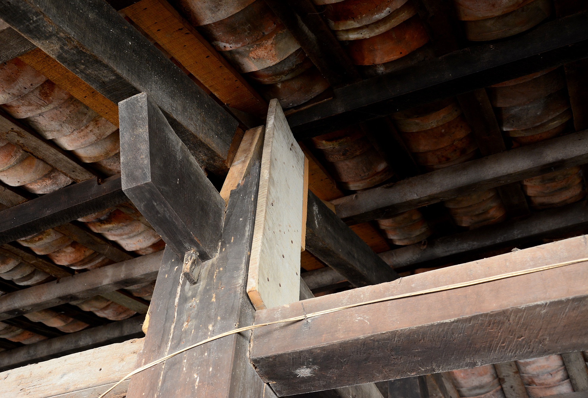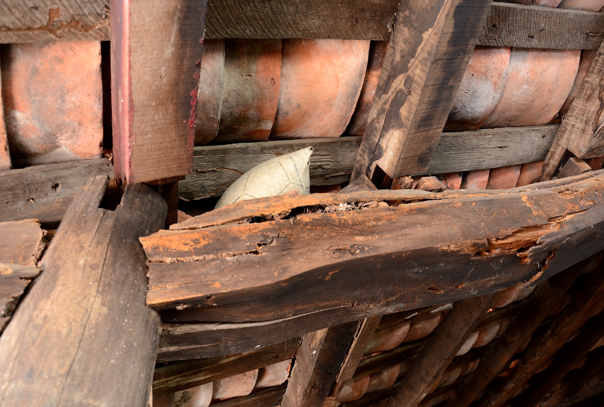 | Các thanh đà, kèo bị mối mục đang phải oằn mình đỡ phần mái. |
