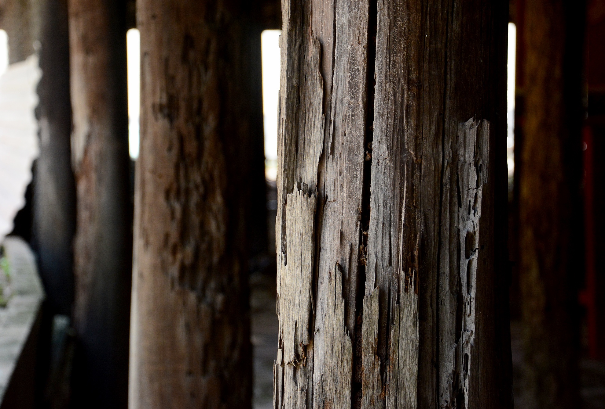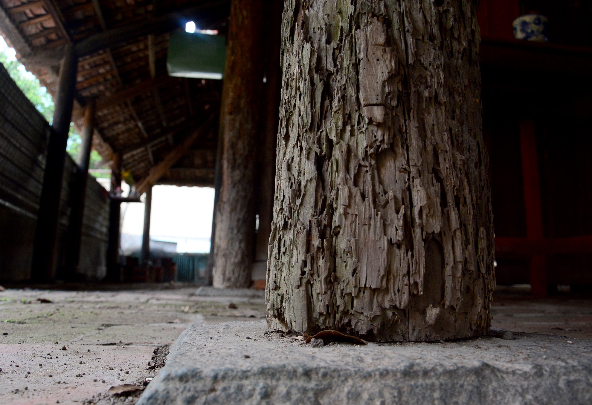 | Một số cột bị mối mọt đục ruỗng, khả năng chống đỡ toàn thân của ngôi đình yếu dần. |