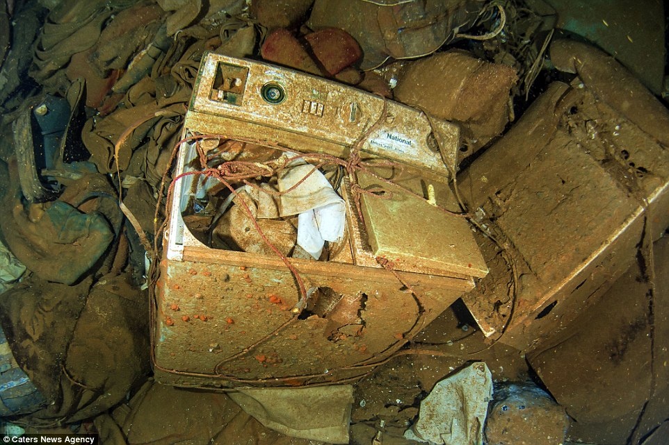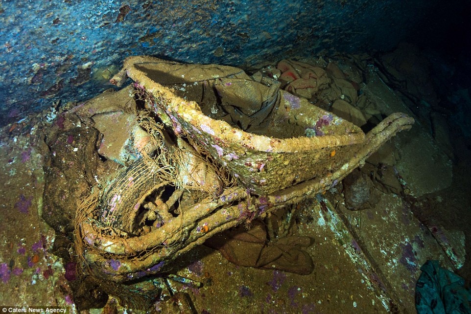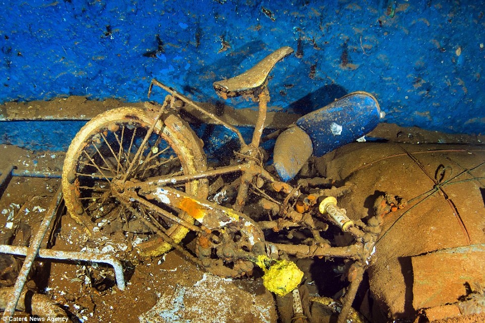 Ở độ sâu 30 m, một xe cút kít đã hoen rỉ nhưng vẫn còn nguyên hình dạng. |