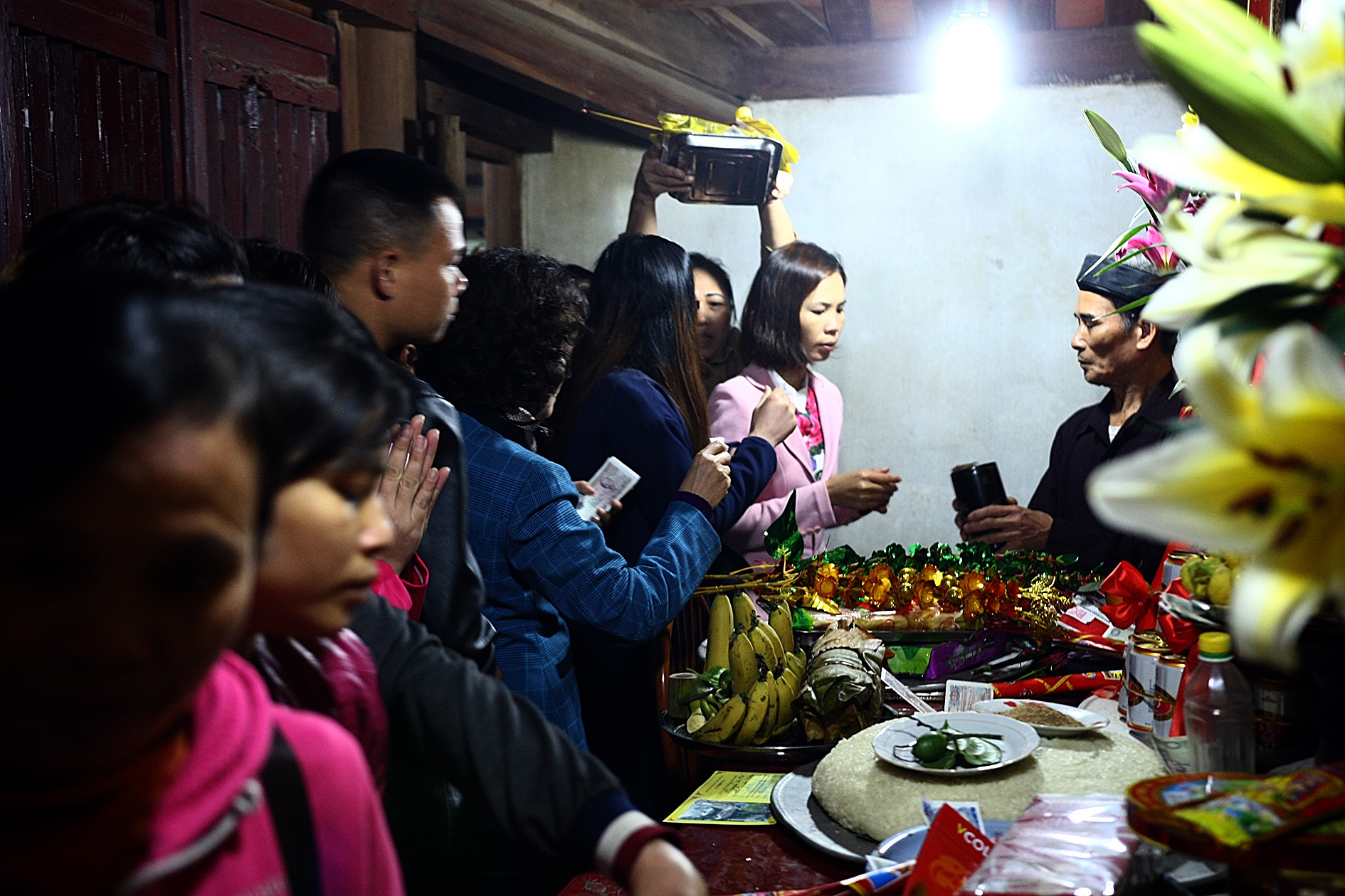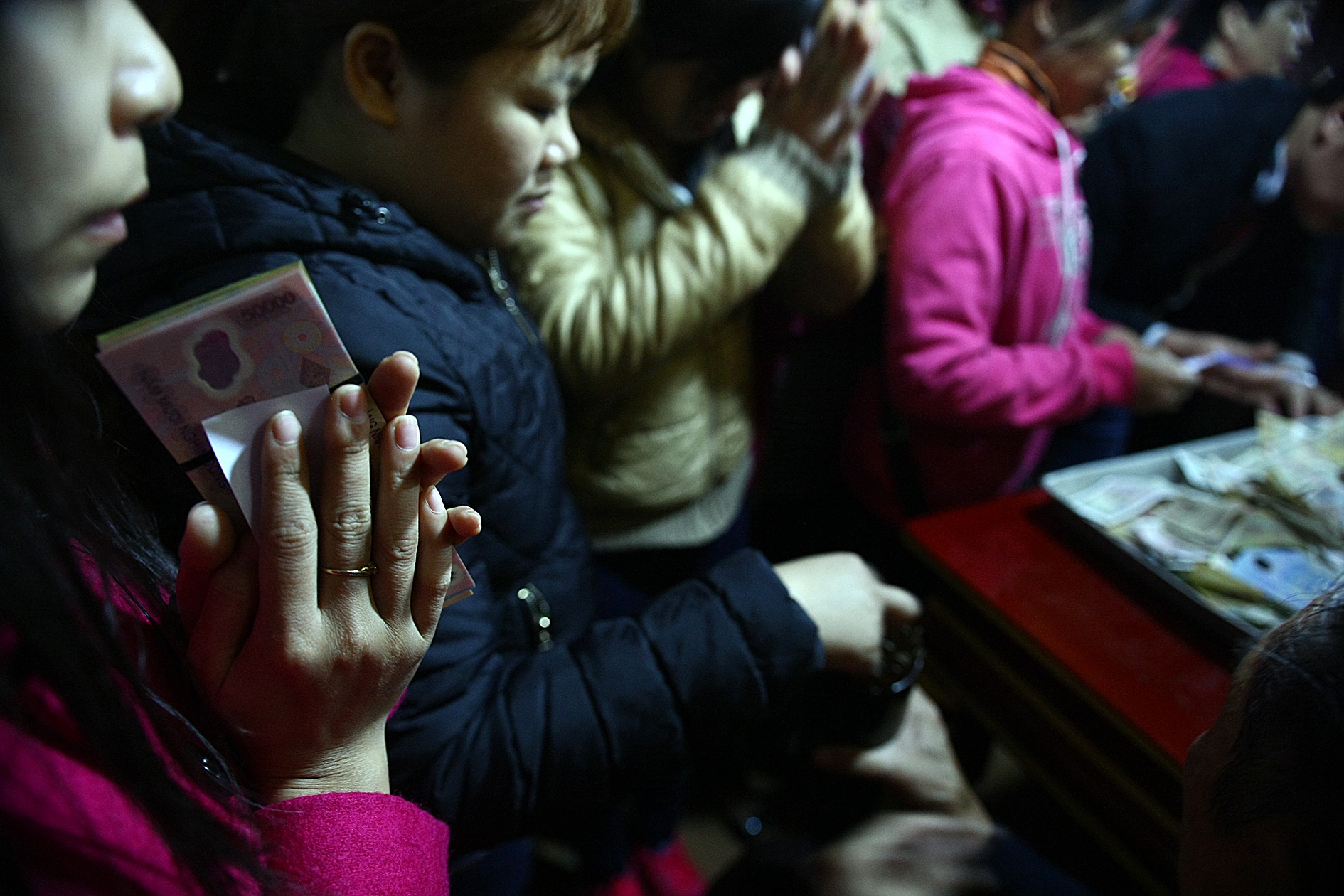 | Rất đông người xếp hàng chờ đợi để được bốc quẻ xem năm mới sẽ gặp may hay vận đen. Ai nấy đều thành tâm chắp tay khấn để được một lá quẻ tốt. |