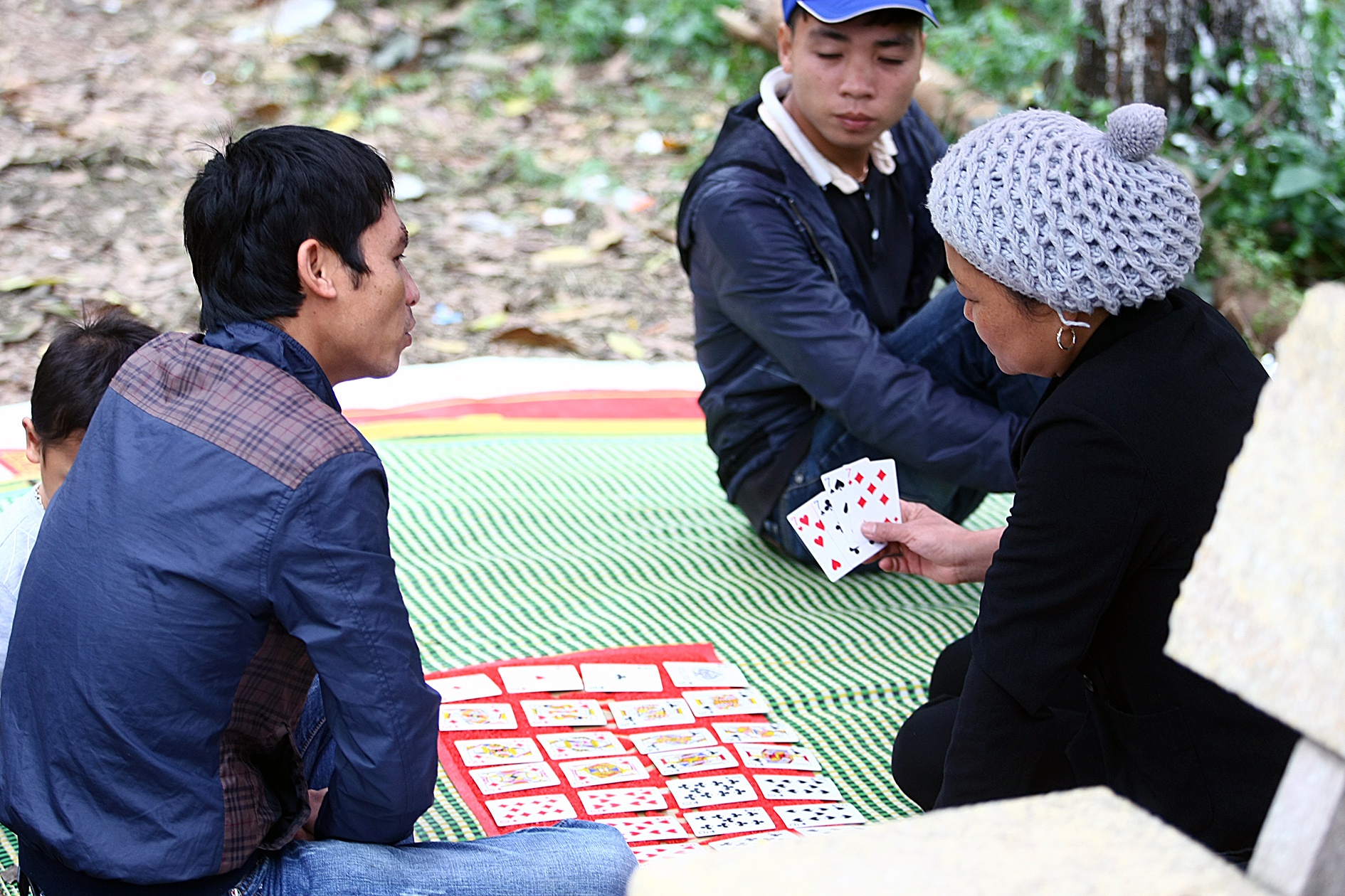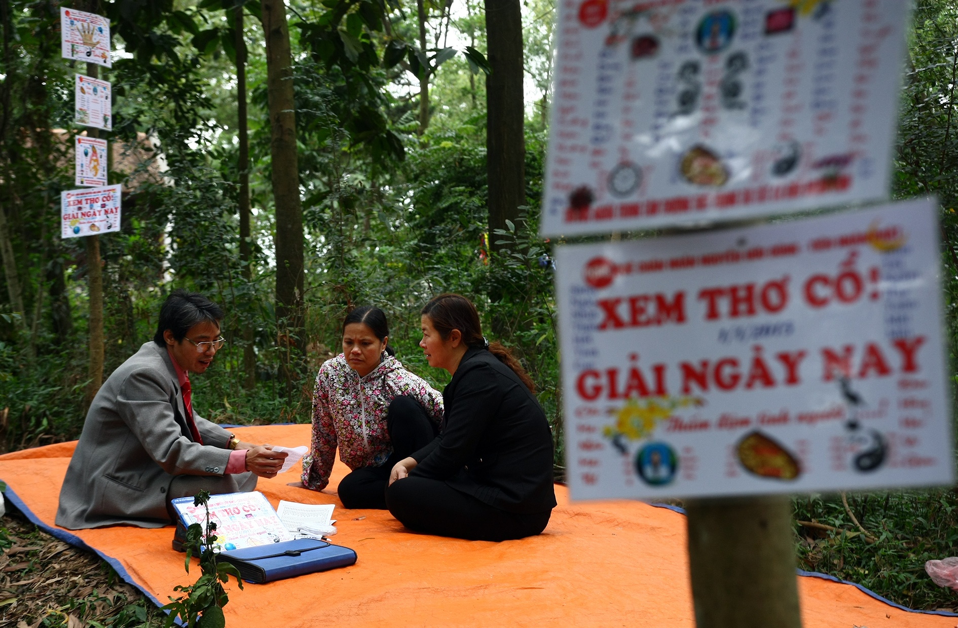 | Phía sau khu vực phát lá số có hơn chục người trải chiếu hành nghề bói bài tây, xem chỉ tay, xem tướng núp dưới hình thức giải quẻ thẻ. |