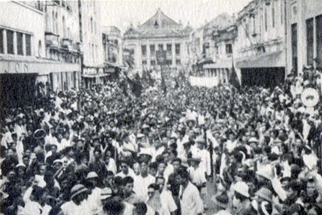 | Hàng vạn người đứng đầy đường Paulbert (nay là phố Tràng Tiền). |