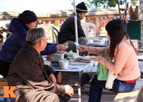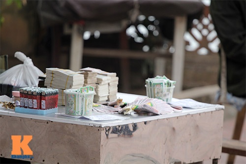 Ở chùa Trấn Quốc, hoạt động đổi tiền lẻ có phần kín đáo hơn. Người đổi tiền không bày “hàng” trực tiếp trên tủ kính mà cất phía dưới hoặc xếp lẫn vào tiền âm phủ. Chỉ khi nào có khách hỏi thì họ mới mang ra. Theo khảo sát, loại mệnh giá 500 đồng được đổi ở mức “10 ăn 6”.