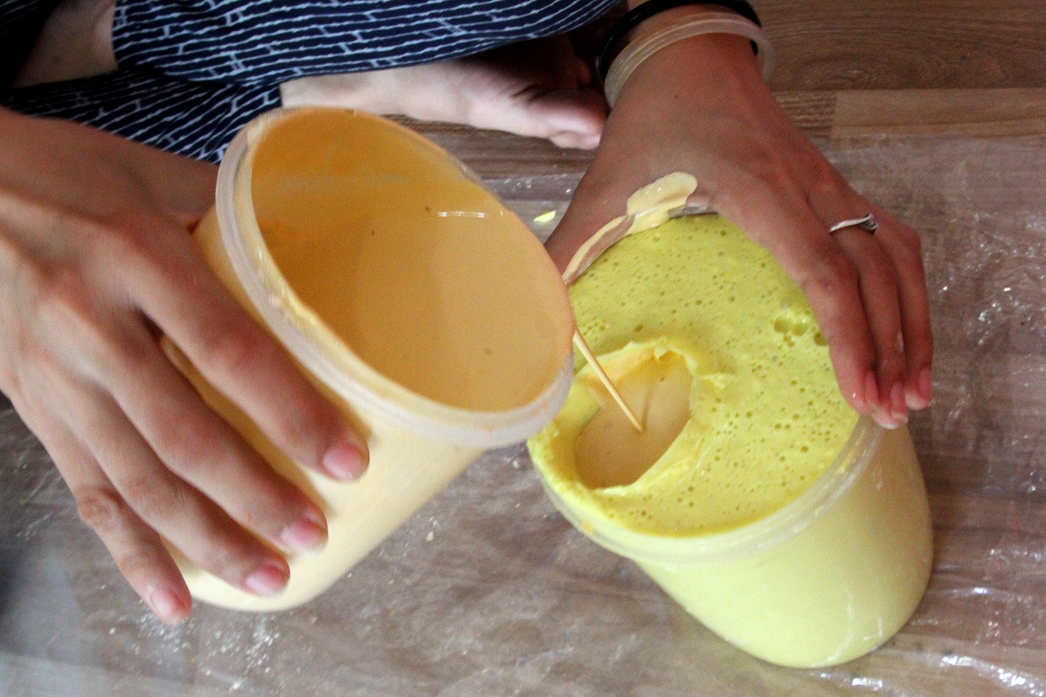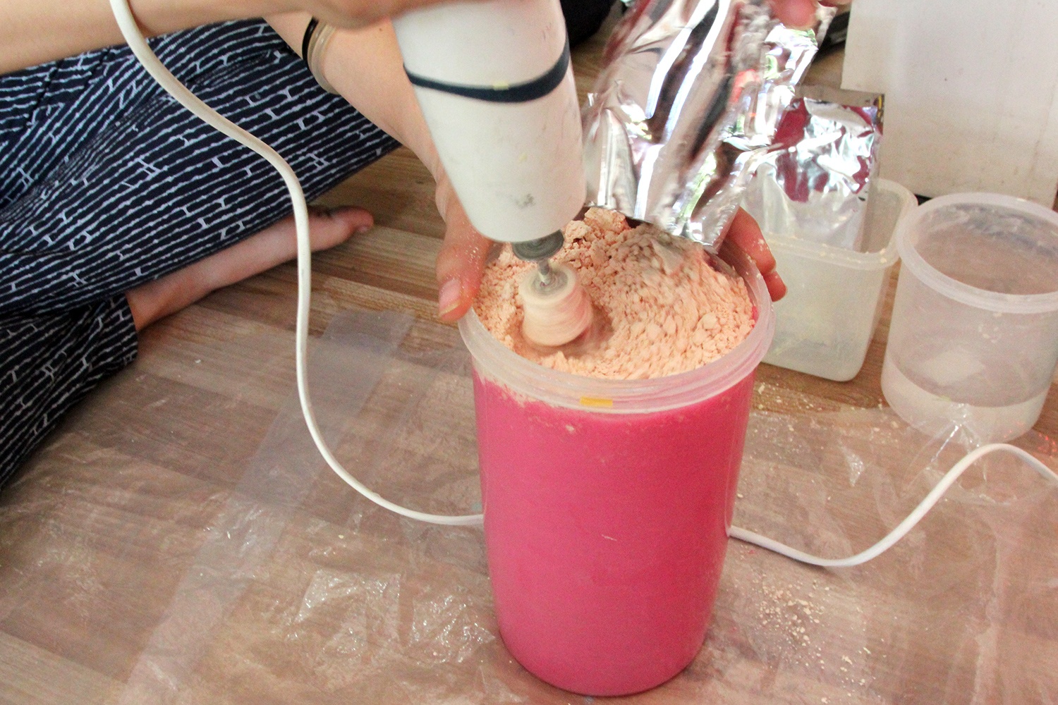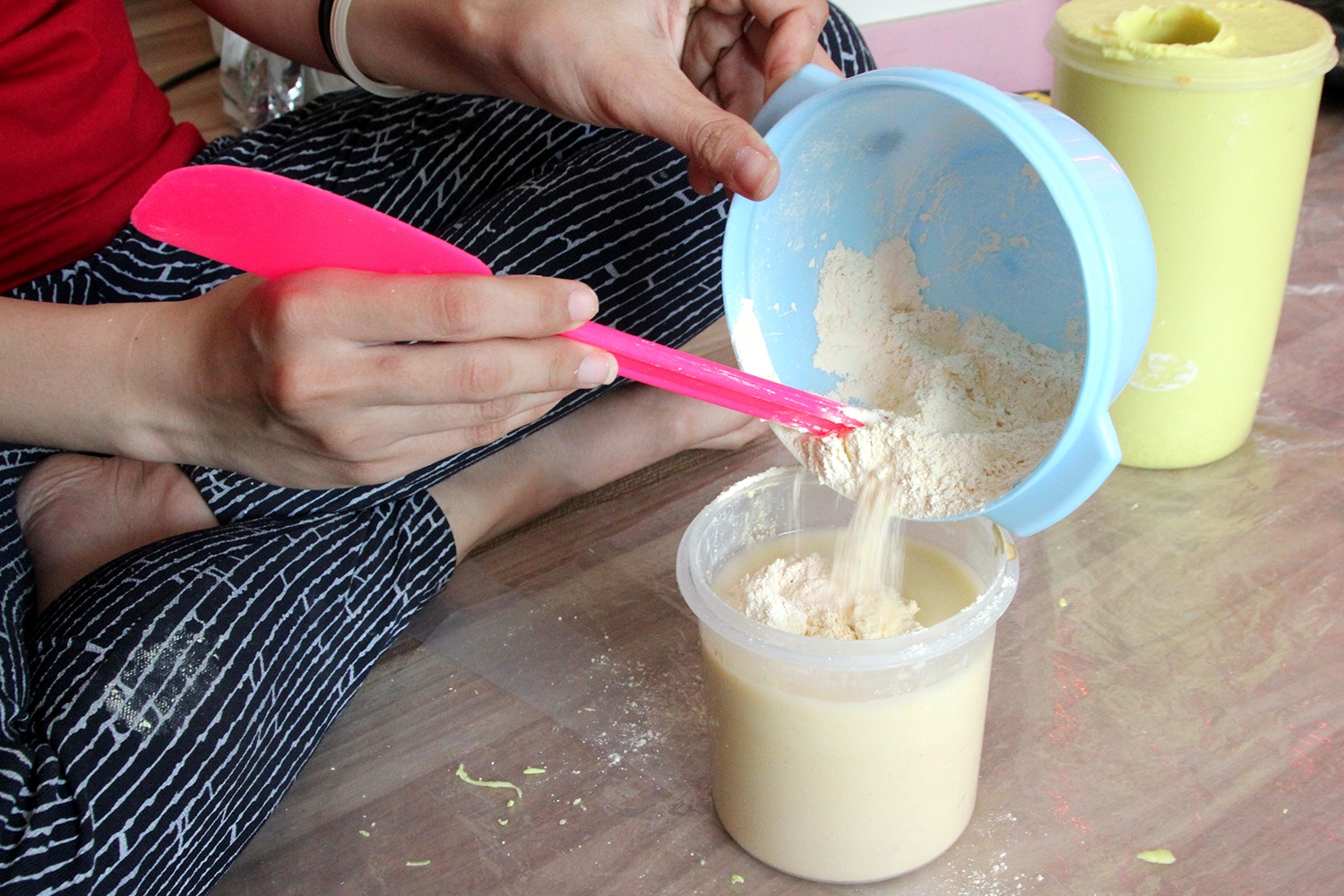 | Bột được pha thành dung dịch đặc sệt rồi đổ vào khuôn để tạo hình. |