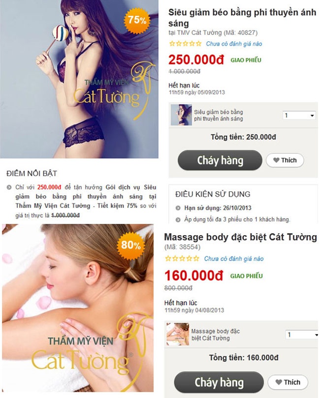 Theo đó, phiếu mua hàng theo nhóm hưởng tiết kiệm 75% của thẩm mỹ viện Cát Tường có giá bán 250.000 đồng, được áp dụng tối đa 3 phiếu cho một khách hàng. Khách hàng mua gói 5 phiếu ngay lập tức được tặng thêm 1 lần, mua gói liệu trình 10 lần sẽ được tặng thêm 2 lần giảm béo nữa. Hạn sử dụng của phiếu mua hàng này còn tới 26/10, và đã cháy hàng.
