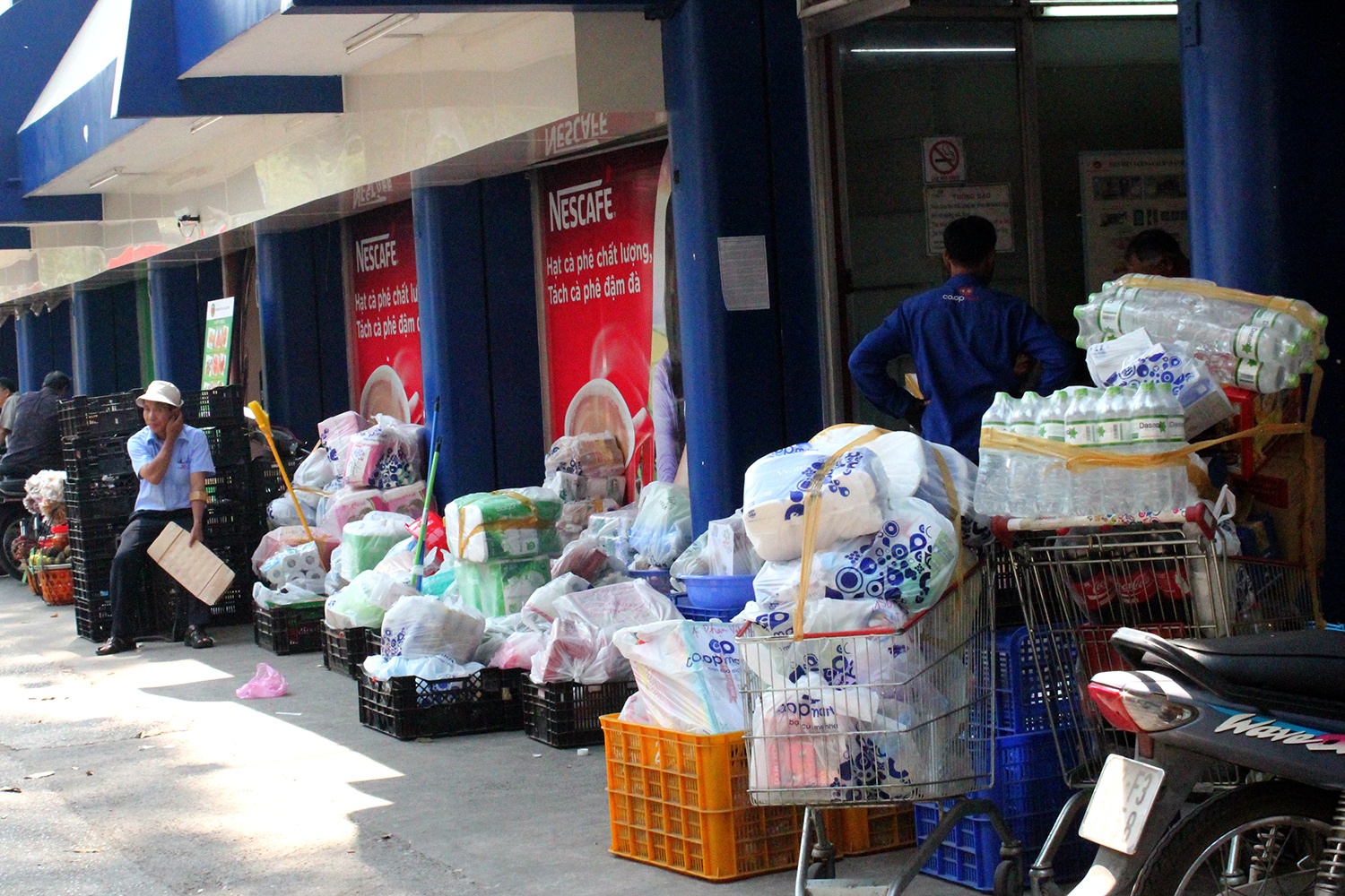 Tại siêu thị Co.opmart trên đường Nguyễn Đình Chiểu, quận 1, tối 12/2, khu vực giao hàng không còn một chỗ trống. Hàng hóa được chất ngay trên vỉa hè để chờ nhân viên đi giao.