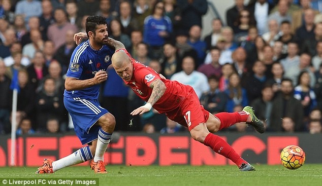 | Costa và Skrtel thường xuyên va chạm nhau. Ảnh: Daily Mail. |
