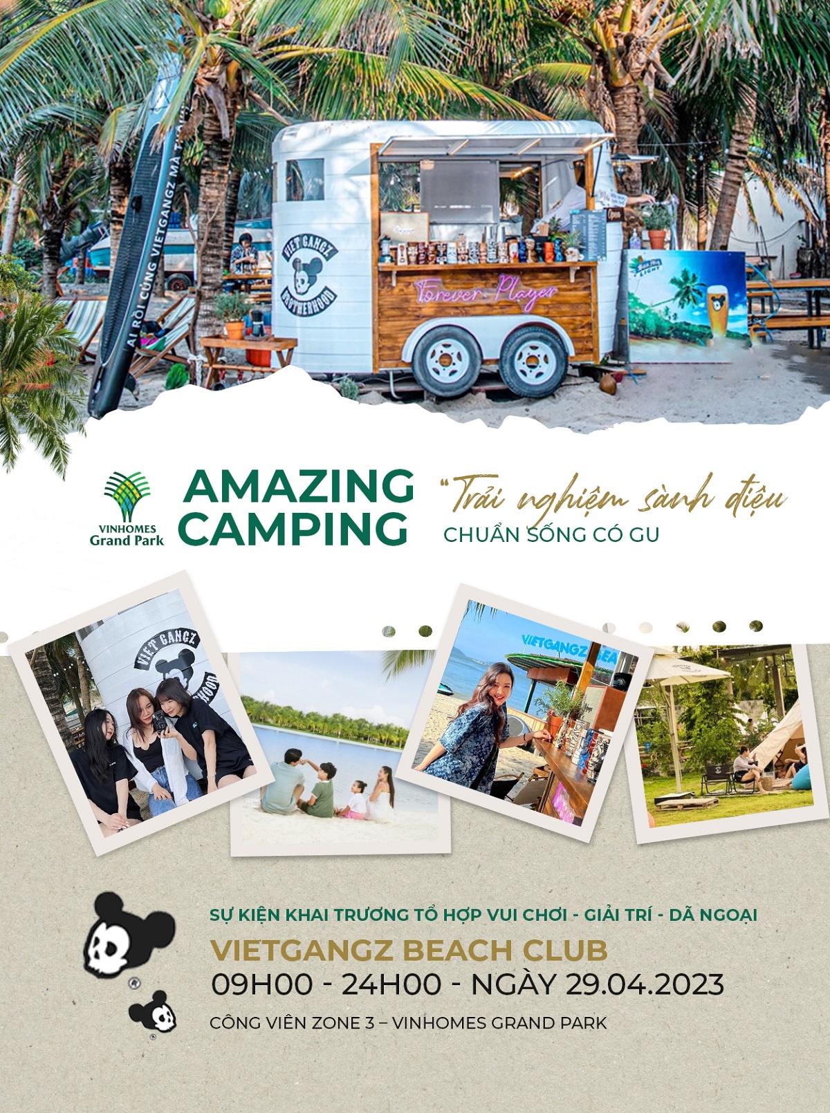 Mô hình khu tổ hợp vui chơi - giải trí - dã ngoại Vietgangz Beach Club không còn xa lạ với giới trẻ tại Hà Nội, Đà Nẵng, Vũng Tàu (Bà Rịa - Vũng Tàu). Tuy nhiên, với người dân TP.HCM, kỳ nghỉ này là lần đầu tiên họ có dịp trải nghiệm hoạt động camping mới lạ, độc đáo ngay tại khu đại đô thị Vinhomes Grand Park. Đây cũng là đô thị đầu tiên tại TP.HCM có hoạt động dã ngoại ngay trong khuôn viên dự án với diện tích khu tổ hợp lên tới hàng nghìn mét vuông.