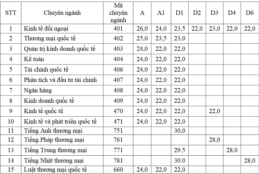 | Điểm trúng tuyển theo từng chuyên ngành của ĐH Ngoại thương. |