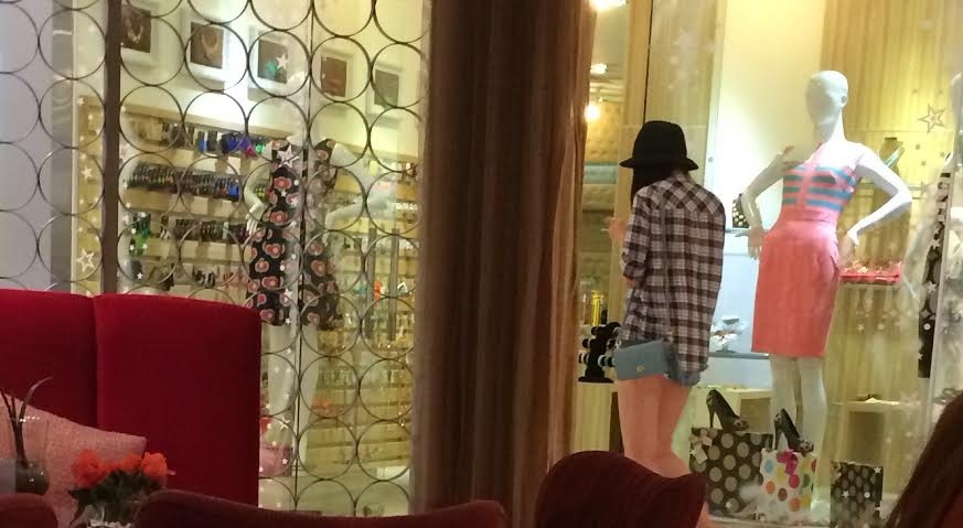 Hoa hậu thế giới người Việt 2010 xuất hiện khá kín. Cô diện trang phục đời thường bình dị với áo ca-rô và quần short ngắn. Người đẹp đeo kính râm đen và bịt khẩu trang nên không ai nhận ra cô có mặt tại quán.
