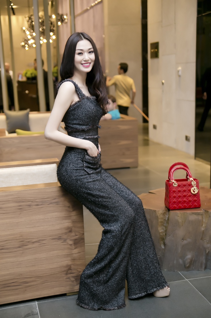 | Nữ diễn viên Mỹ nhân Sài thành khéo kết hợp phụ kiện túi Dior gam đỏ hợp tông bộ jumpsuit sang trọng. |