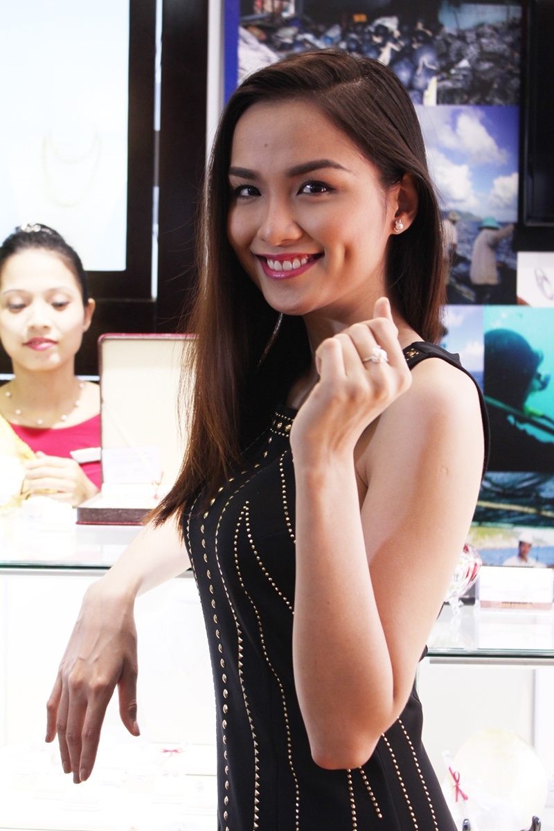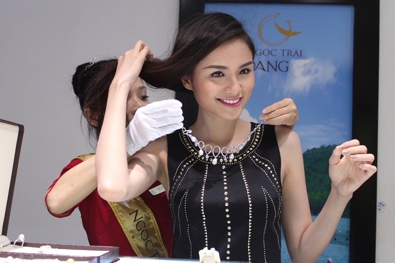 Xuất hiện tại cửa hàng ngọc trai, người đẹp thu hút mọi ánh nhìn dù chọn cho mình bộ trang phục giản dị với lối trang điểm khá nhạt nhưng vẫn toát lên sắc đẹp tự nhiên.