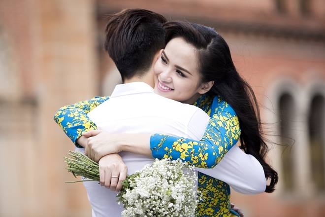 | Diễm Hương không ngần ngại ôm hôn người yêu khi chụp ảnh trên phố. |