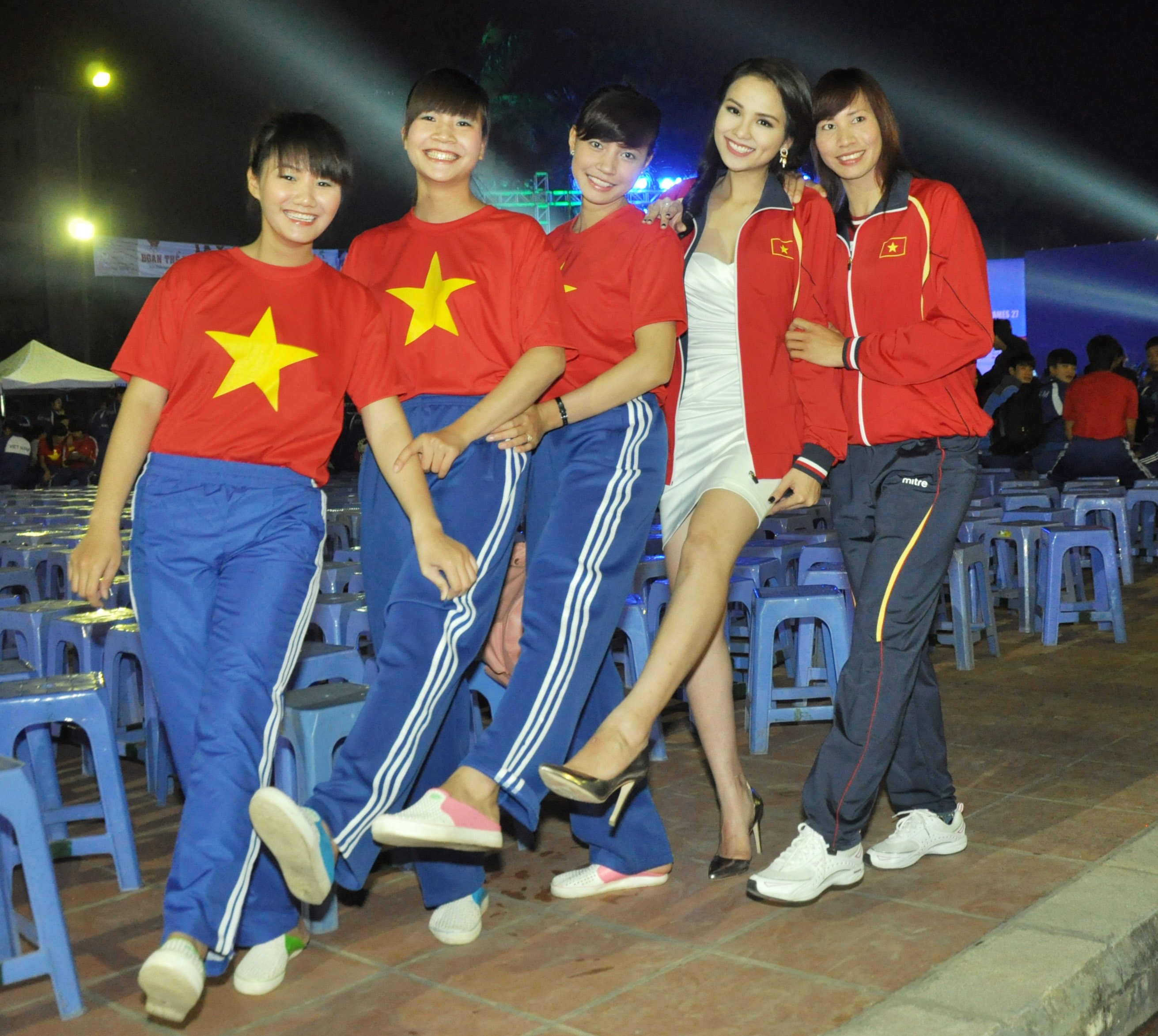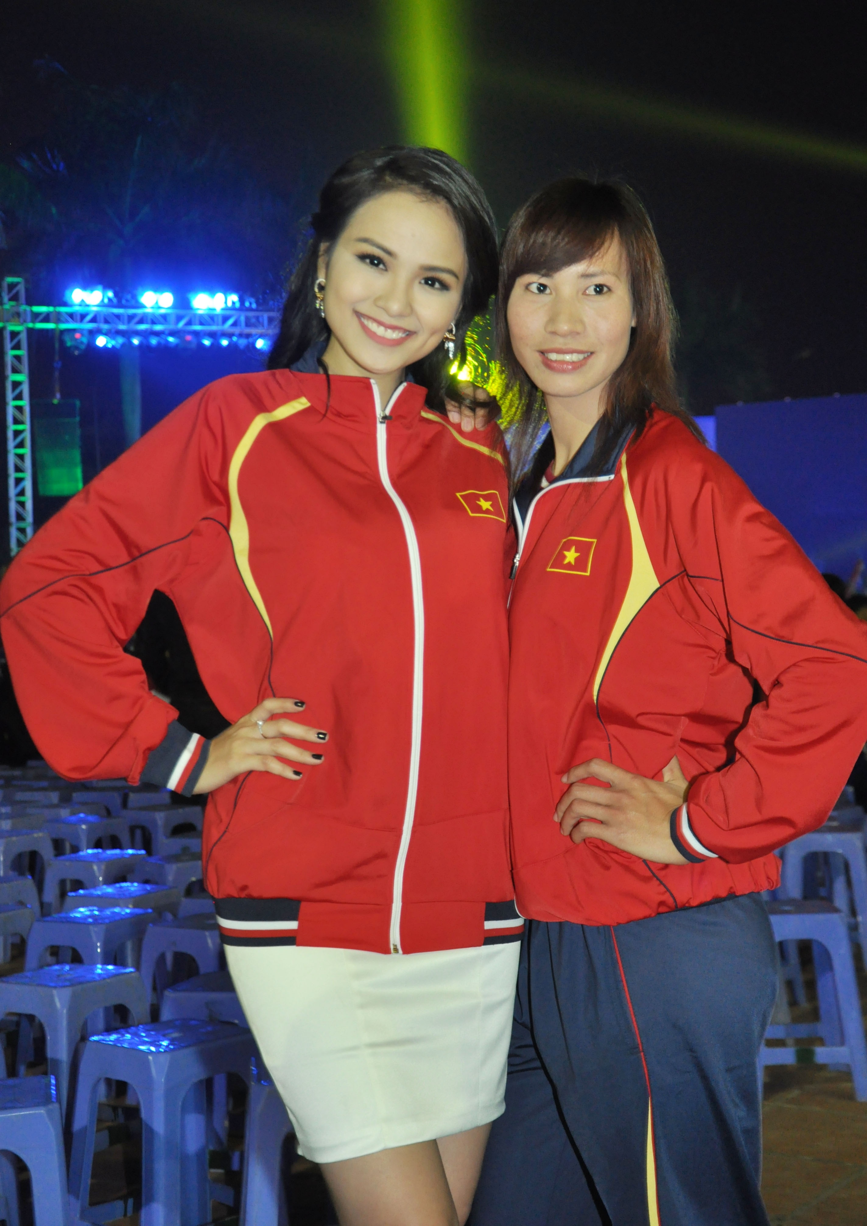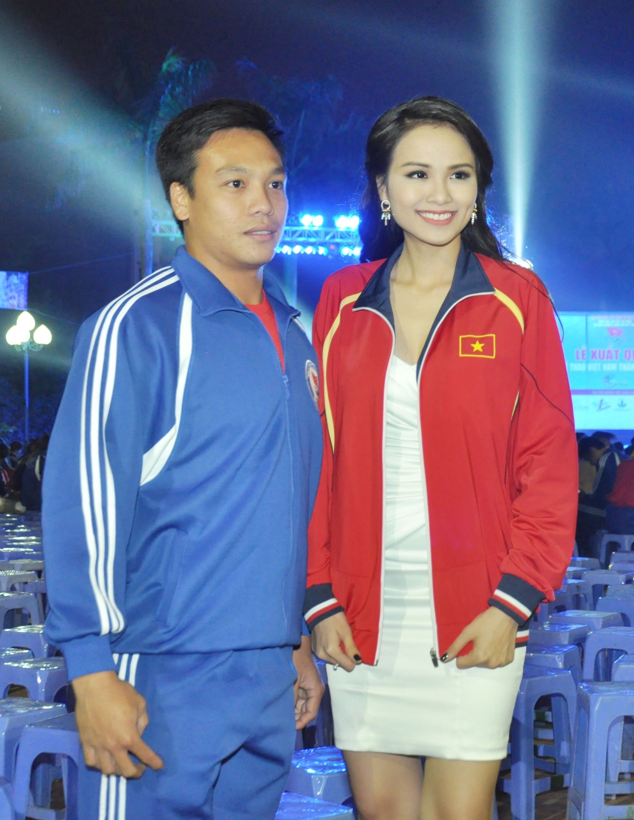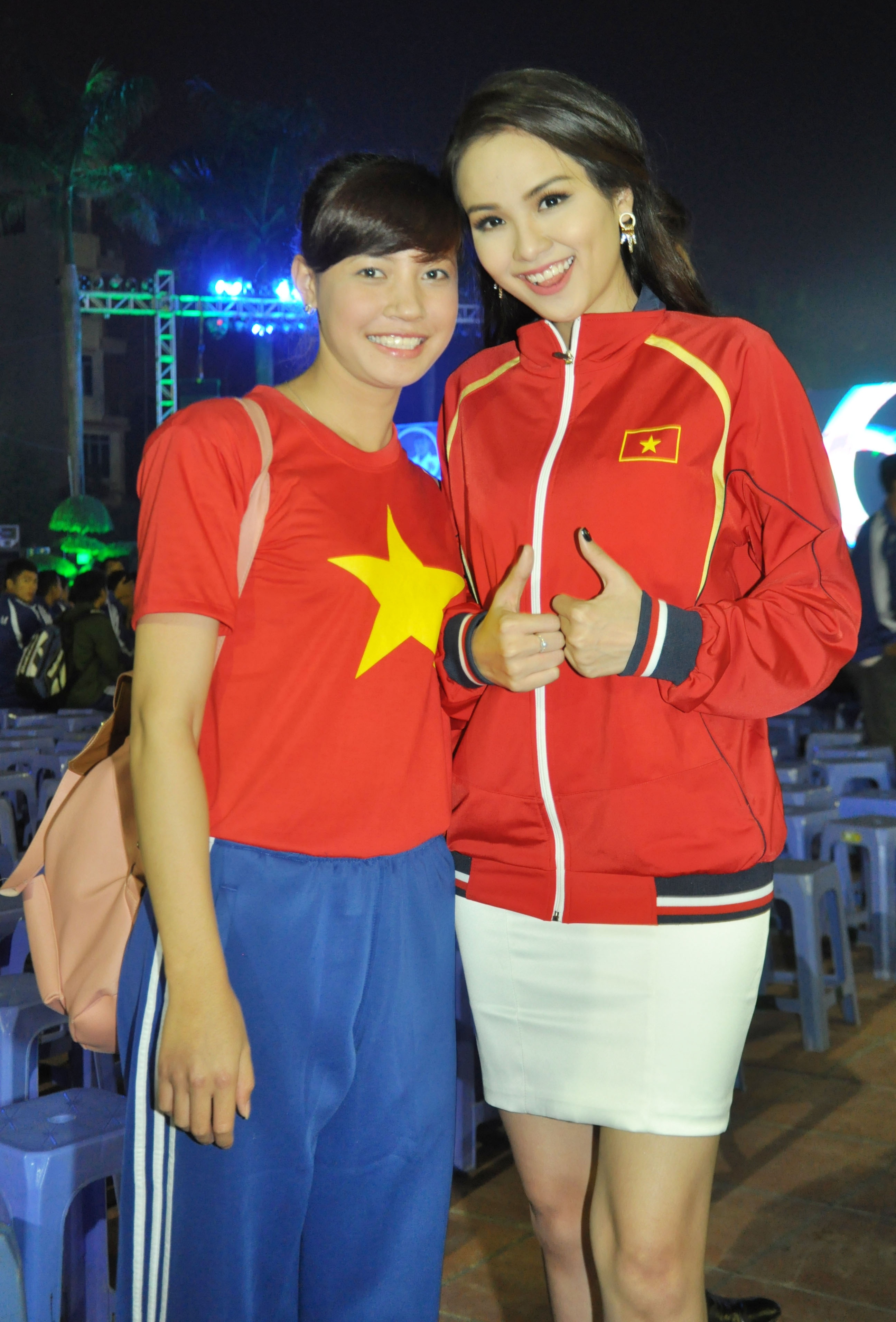 | Hoa hậu Diễm Hương diện một chiếc áo của các tuyển thủ rất ấn tượng, cô tạo dáng và thể hiện niềm tự hào khi khoác lên mình chiếc áo mang tinh thần dân tộc. Người đẹp luôn nhiệt tình và tươi cười khi được các tuyển thủ đề nghị chụp ảnh chung. |