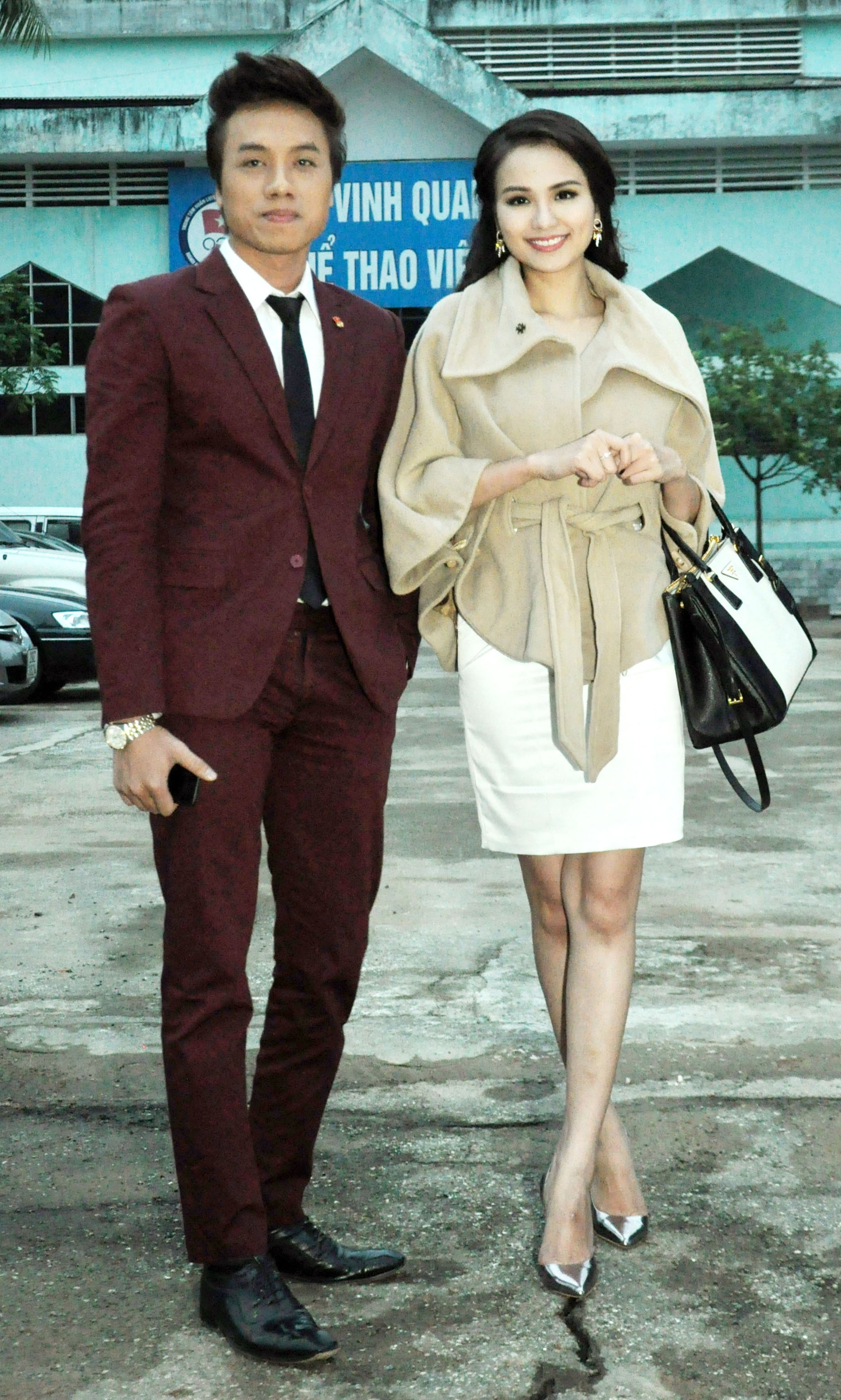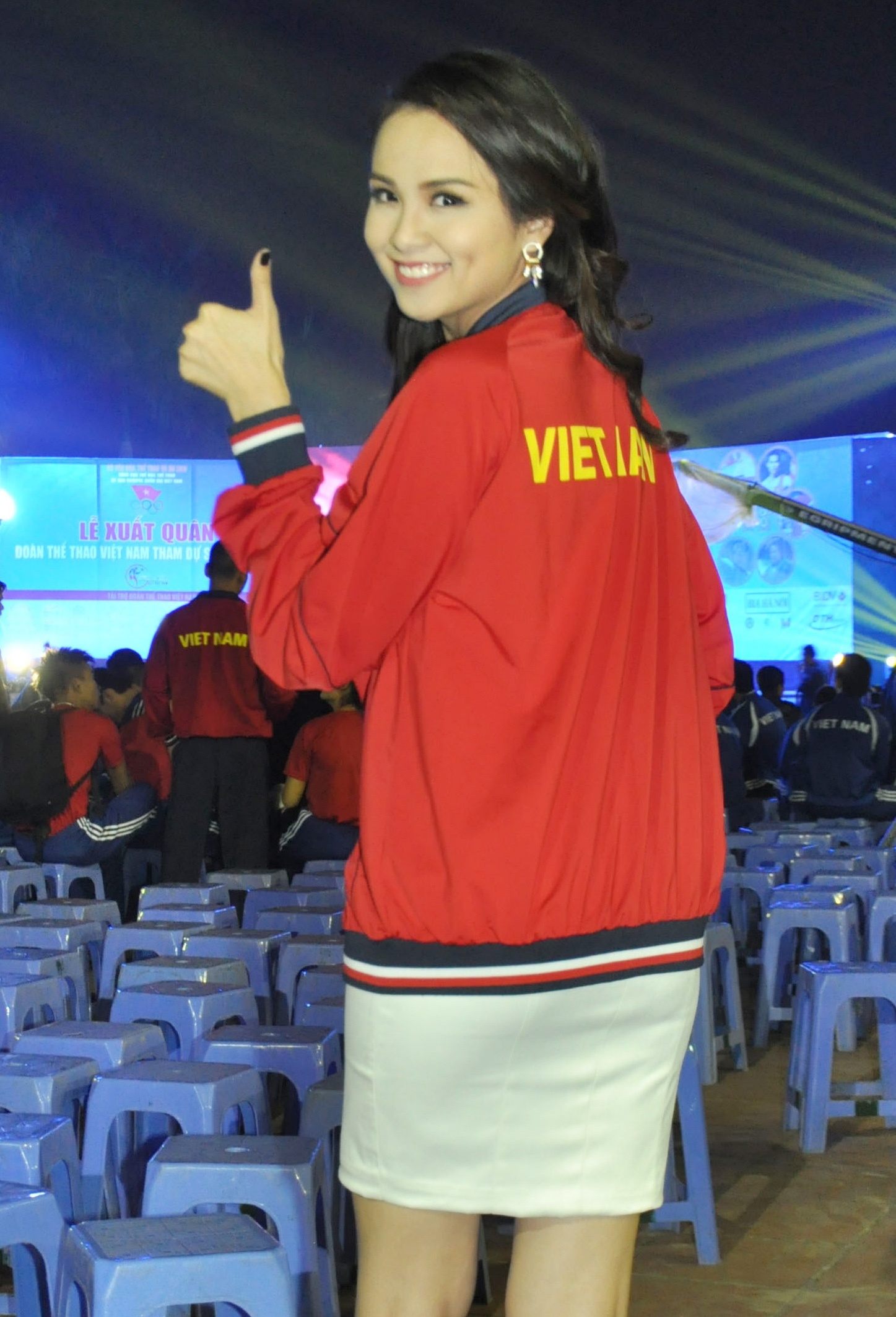 Diễm Hương trong một chiếc áo khoác màu đỏ đậm tinh thần truyền thống, cô tinh nghịch tạo dáng phía sau khán đài.