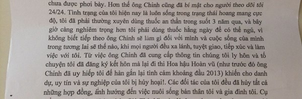 - Nếu được sống trong sự sung sướng, yêu thương và tôn trọng, không có người phụ nữ nào quyết định bỏ hết tất cả để chạy lấy thân như tôi. 3 năm qua, đó là cuộc đấu tranh đòi lại sự tự do cho mình. Như trong đơn tôi có nói, 3 năm qua tôi bị stress và phải uống thuốc an thần mỗi ngày. Nói thật, nếu cuộc đời tôi nhìn lại, tôi muốn quên đi 3 năm vừa qua vì đã quá mệt mỏi với những bi kịch trong cuộc đời mình.
