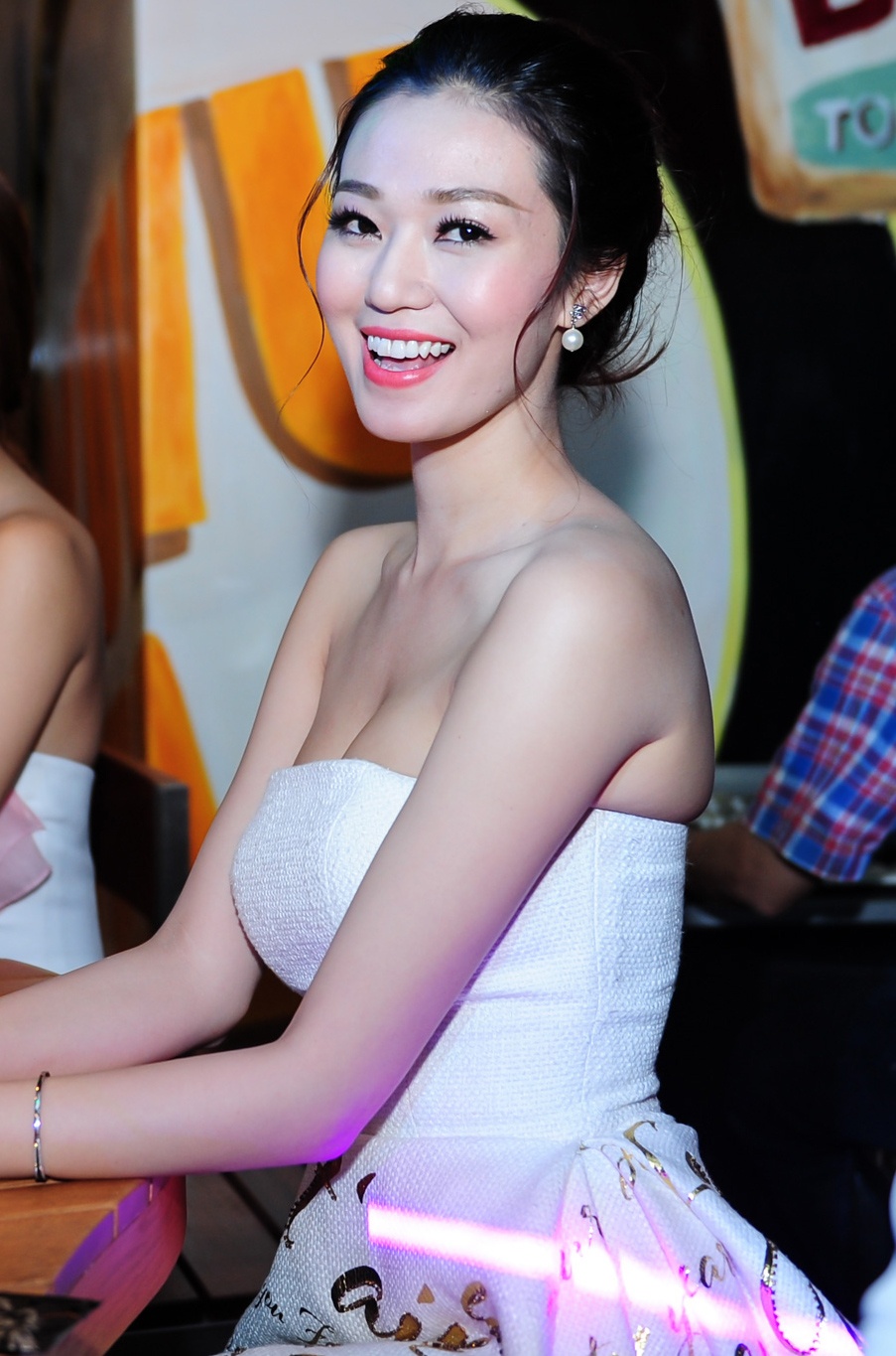 | Khánh My khoe vai trần gợi cảm với váy cúp ngực trong sự kiện. |