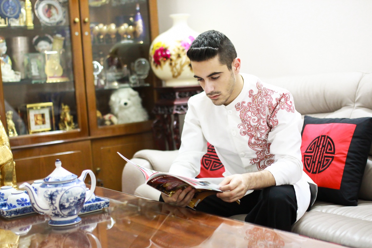 Bạn nhảy điển trai tranh thủ đọc sách trong thời gian đợi Diễm My chuẩn bị bữa cơm.